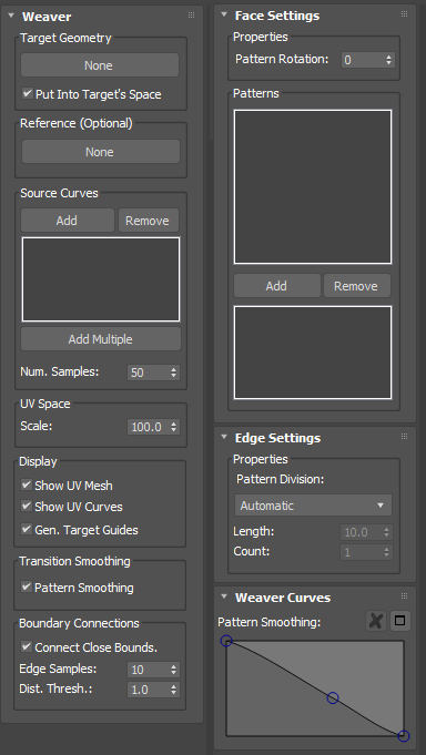 When target mesh has texture coordinates patterns are generated in its local UV space. With controls in this section you can edit per-face pattern parameters. If a reference mesh is used then the faces of the reference mesh are used instead. This is very useful for simplifying the topology of the patterns when the target mesh has a lot of detail and it allows target mesh topology to change arbitrarily while retaining the same weave structure.