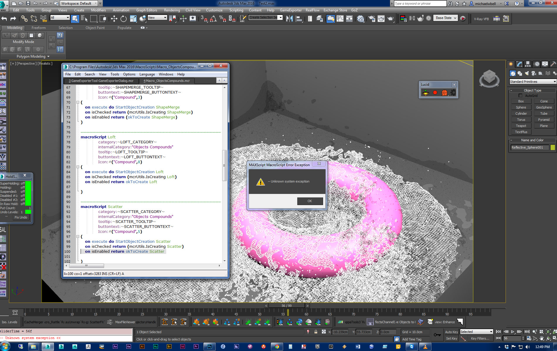 | Description: | I have seen a thread where a user reported a crash when attempting to select a meshed object. I am not sure if this is related. Everytime I select a meshed object in the viewport there are 1-3 "--Unknown system exception" messages and the Maxscript editor appears. I have attached a screenshot. The scene seems fine aside from this - Max does not crash and the simulation and workflow can continue. |