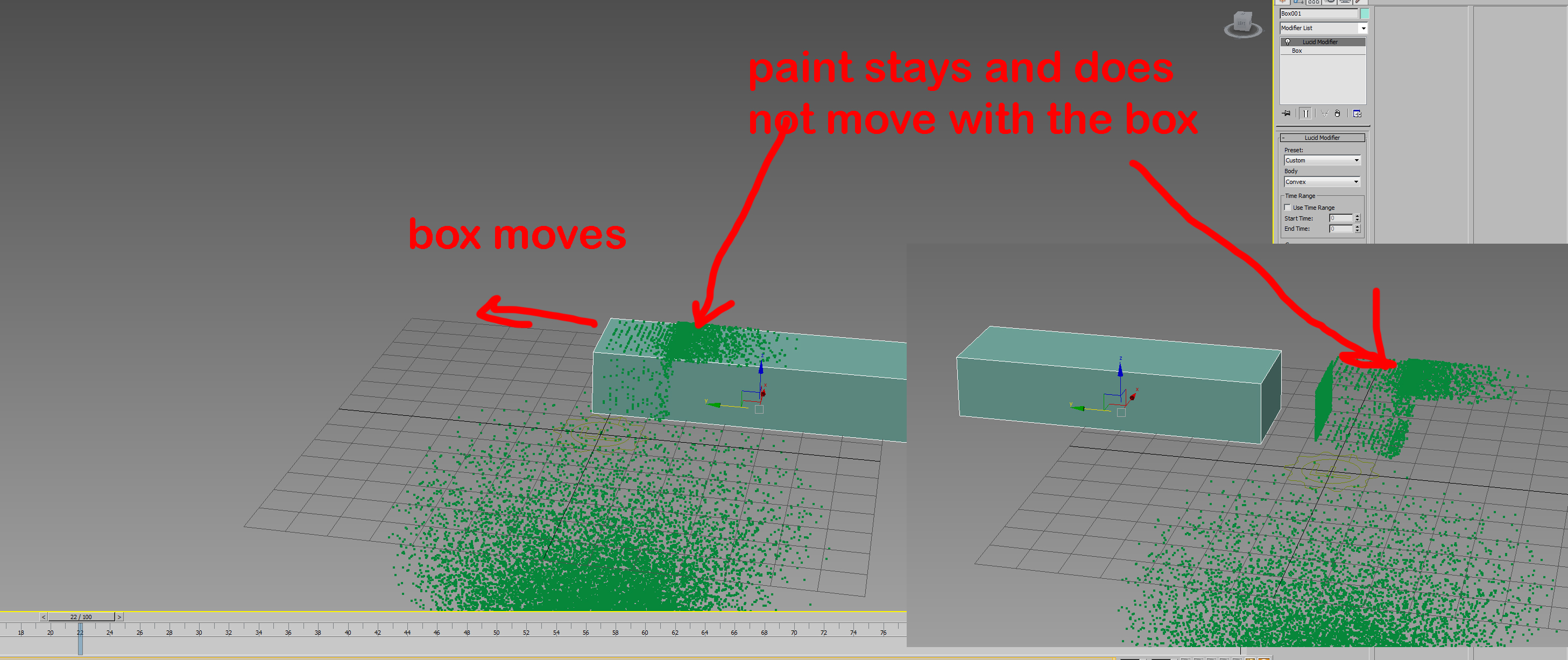 | Hi Marsel I attached an image. You can see there paint is dumped on a moving box but does not travel with the box. Would be nice to have an option where paint or mud gets stuck to moving objects. I set adhesion to 1. Thanks |