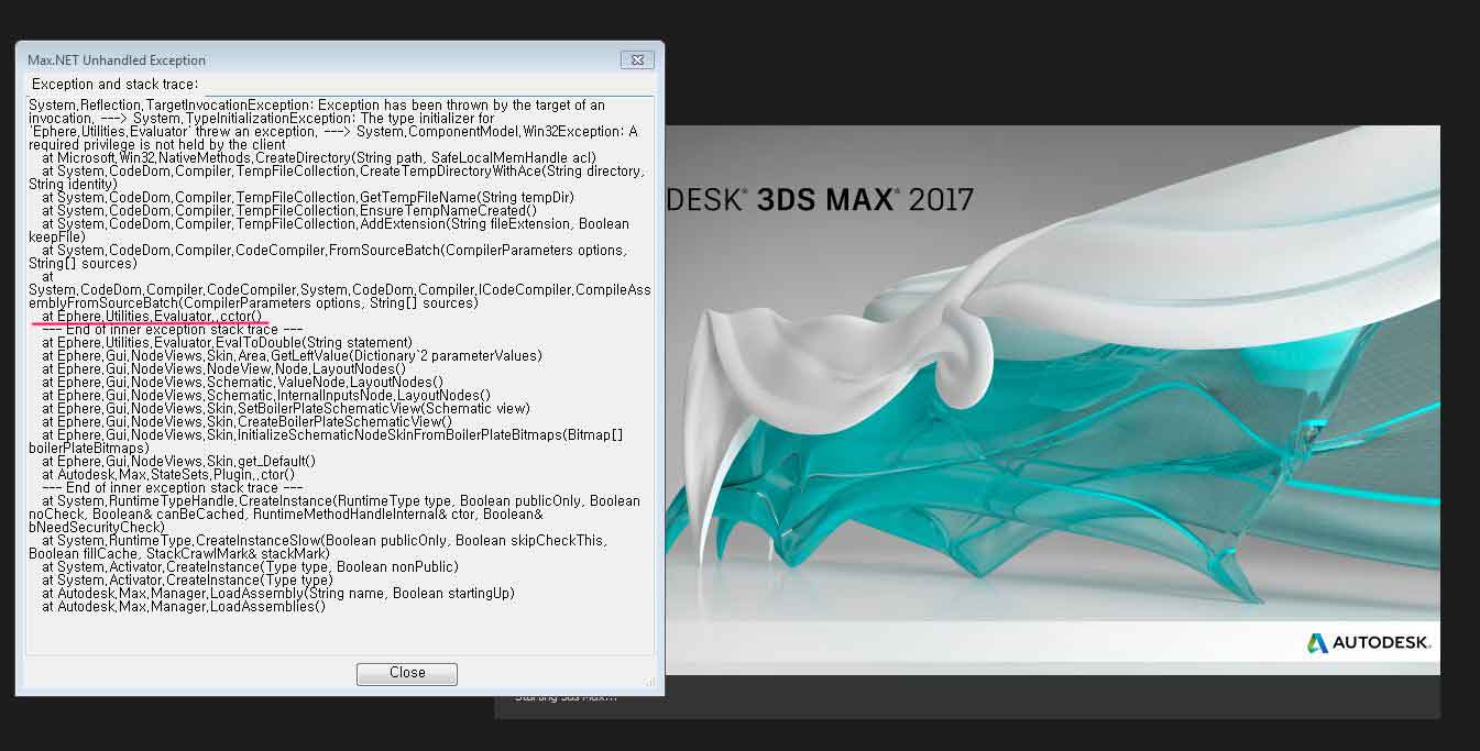 System.Reflection.TargetInvocationException: Exception has been thrown by the target of an invocation. ---> System.TypeInitializationException: The type initializer for 'Ephere.Utilities.Evaluator' threw an exception. ---> System.ComponentModel.Win32Exception: A required privilege is not held by the client