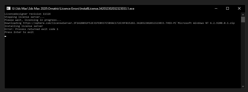 | Steps to Reproduce: | Then I tried to install the licence manually. I downloaded Ephere.Licensing.LicenseServer.Manager.exe and InstallLicense.342032302032323033.1.exe I went to my Assigned Licences selected it and released it. I paused my anti-virus and double-clicked on InstallLicense.342032302032323033.1.exe - I got this (LicenceError05.jpg) Started 3ds Max and when using Ornatrix I get (LicenceError06.jpg 3ds Max 2020 - Ornatrix 6.3.3.22871 |