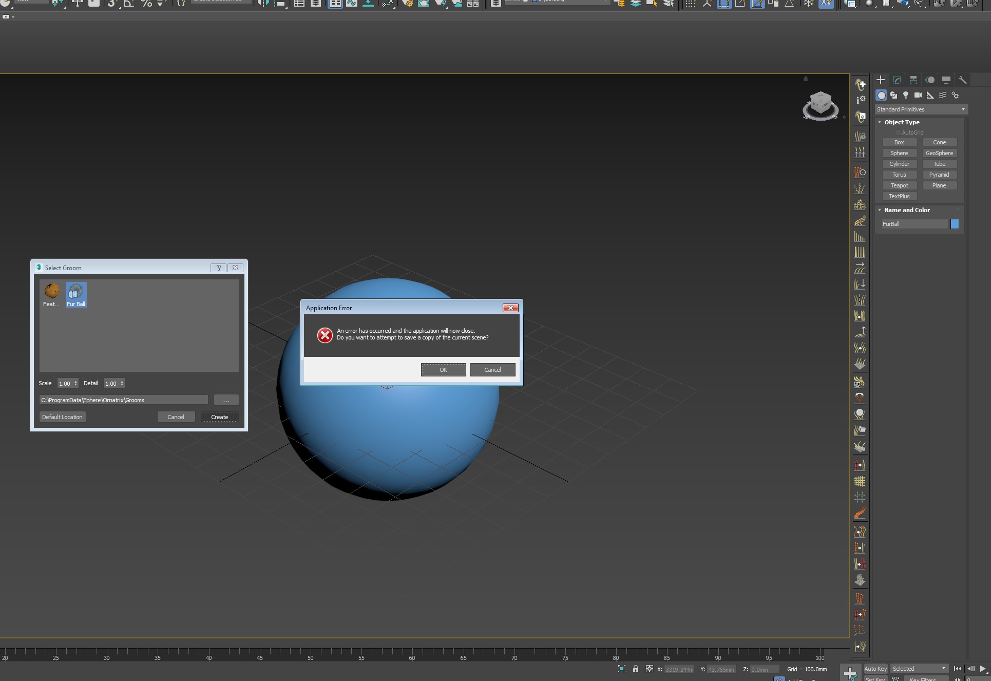 | Steps to Reproduce: | 1 - Start 3ds Max 2017 2 - Create Sphere 3 - Click Ornatrix Toolbar Quick Hair 4 - Click Fur ball 3DS Max fatal error