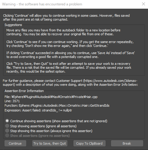 | The error in the .log file that you uploaded was fixed in revision 29630, i.e. it is included in stable 7.3.3. I just tried adding hair to a sphere with wireframe viewports (and by default the ortographic viewports are wireframe, so if you work in 4 views you always have some wireframe), selected it, there's no crash. Could you upload a .log and .dmp again with 7.3.3 ? Ivan Kolev (Software Developer, EPHERE Inc.) Discord: ikolev Email: ivan.kolev at ephere com |