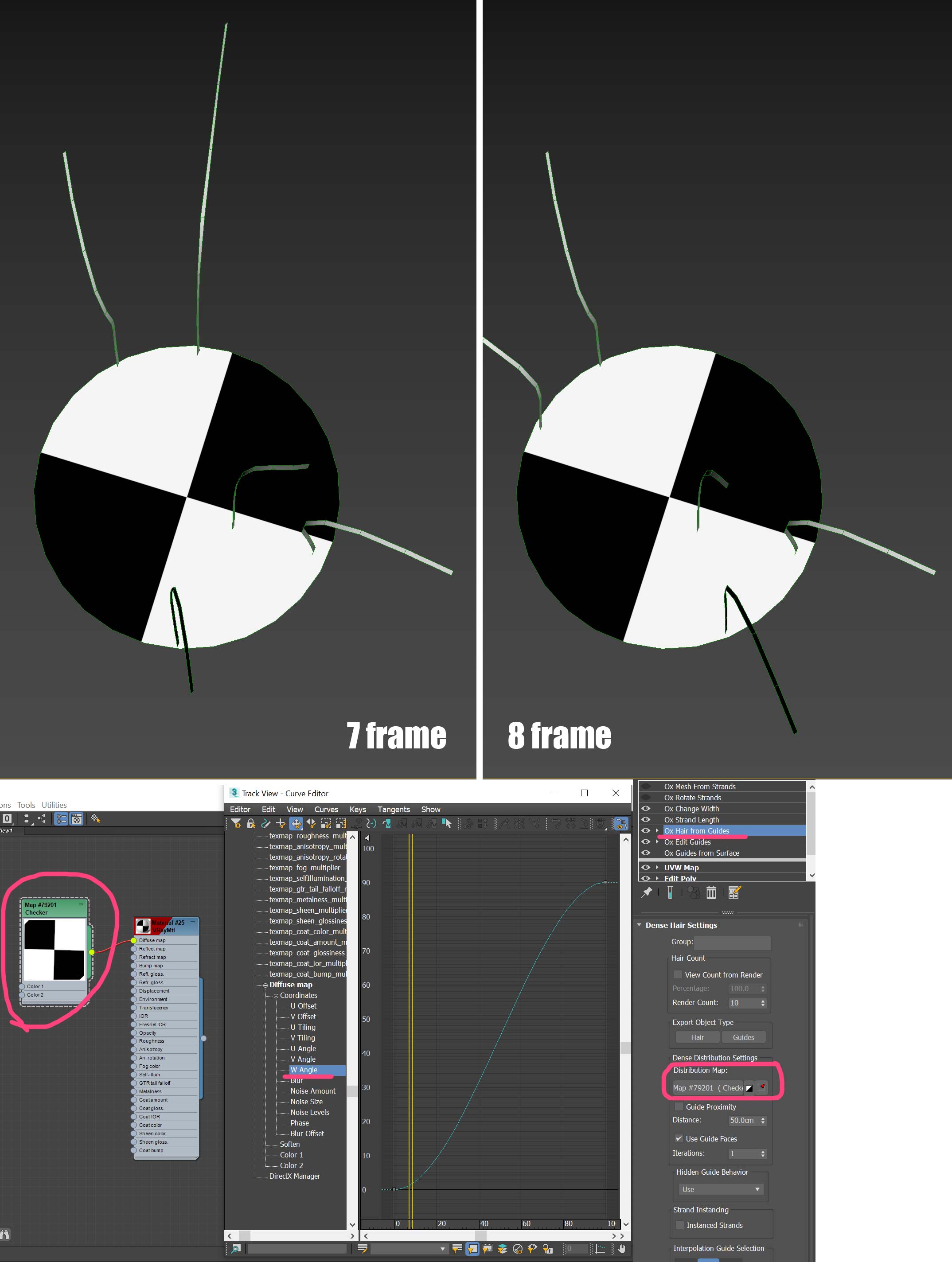 | Description: | For my current project, I am trying to create an animation in which the number of hairs in 'OX Hair from Guides' is reduced according to the change in texture. Here is a screen capture showing serious problems in testing for it. In the 'OX Hair from Guides' command, a rotating 'Checker' texture was applied to the 'Distribution Map'. In the picture below, the left side is 7 frames and the right side is 8 frames. There is little change in the white area, but the change in the hair is significant. There should be no change in the hair in the pure white area, but when tested, the hair randomly disappears, appears, or moves, causing severe changes. is this a bug? Is there any way to solve this problem? |