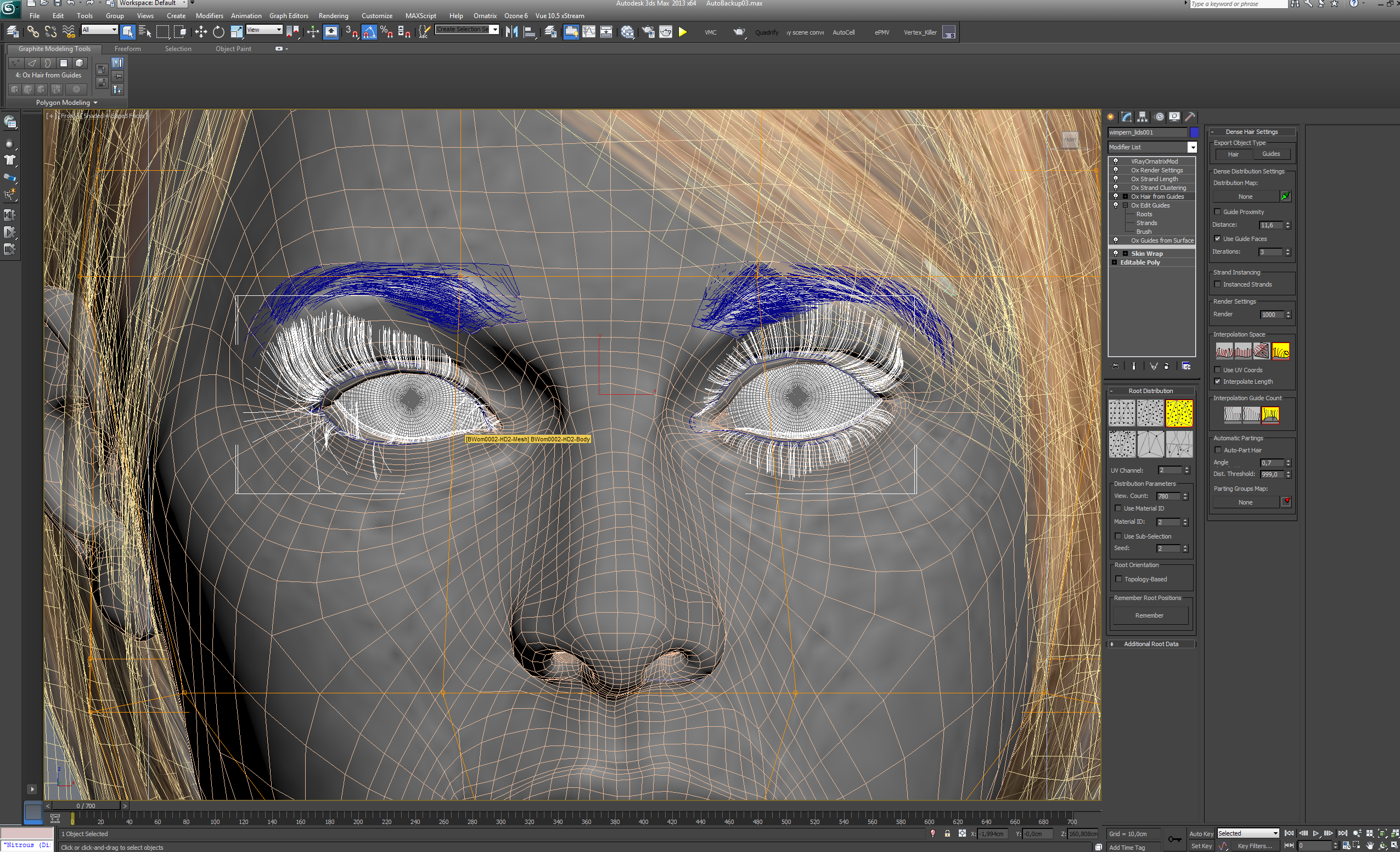 I have detached the edgeloop for the eyelashes to grow hair on the faces. I have set up everything and it looked fine, but after opening the saved file, it doesn't look fine. The lower-left eyelashes seem to have lost their information from the edit guides modifier. Might this be a problem with the underlying skin wrap modifier?