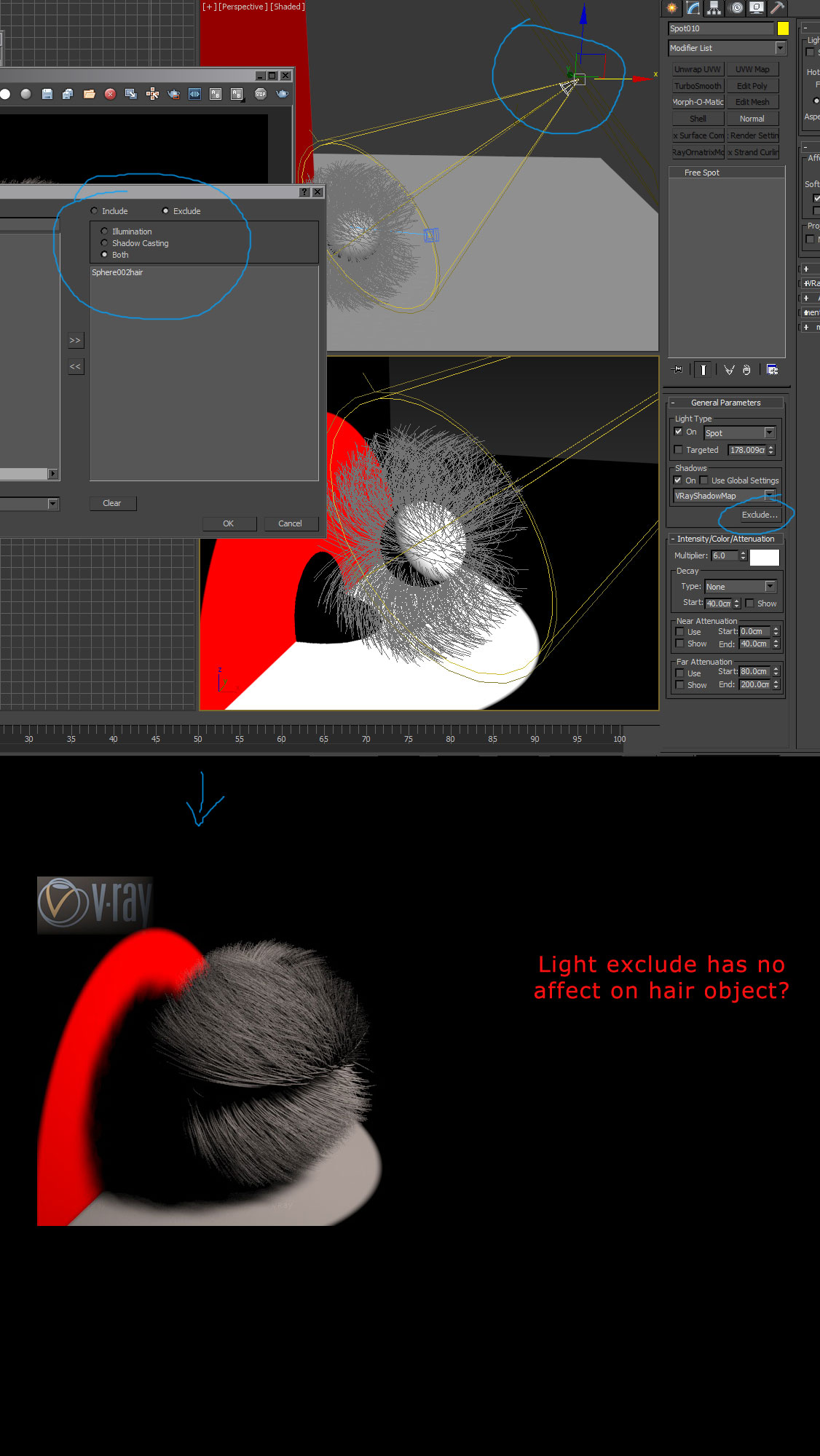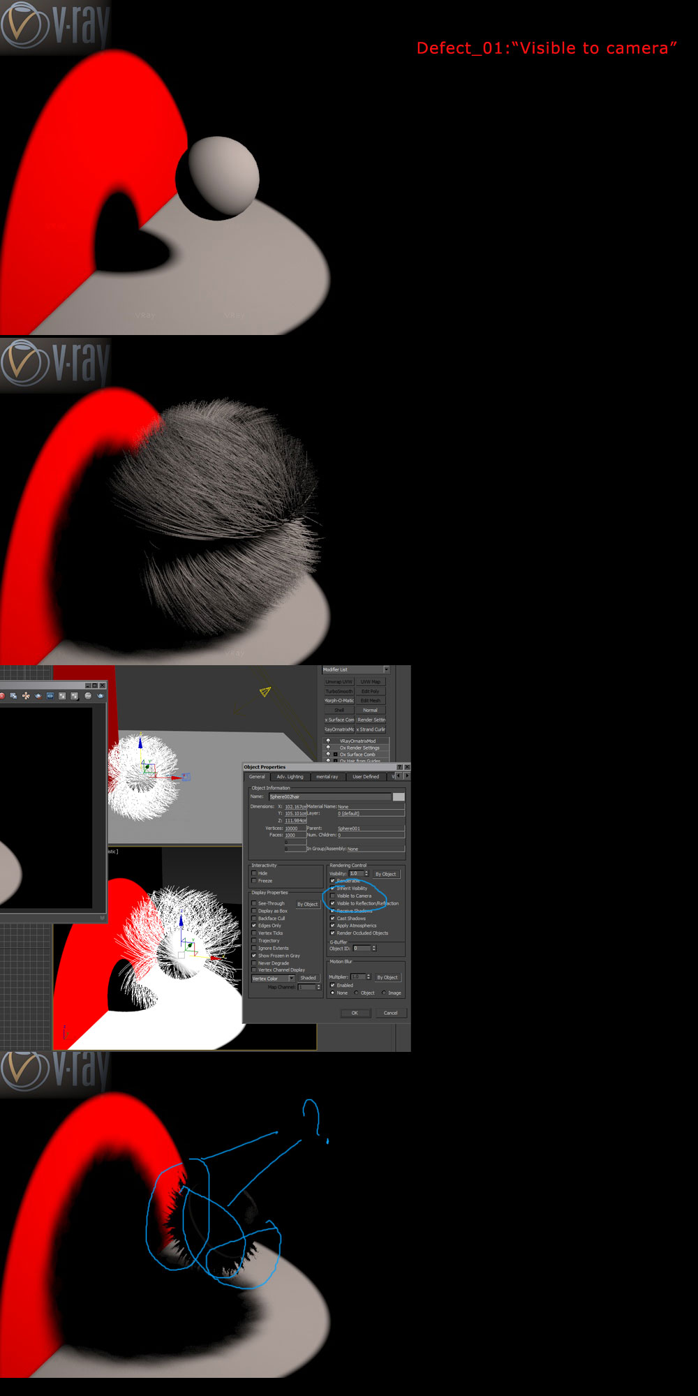 1- excluding hair objects from light has no effect on hair object whatsoever.(any standard light as well as vray lights, exception MR photometric light in the scene crashes the scene entirely). 2 - "visible to camera" checkbox while unchecked produces straneg artifacts. Please find attached below some images which hopefully help describe the issues.