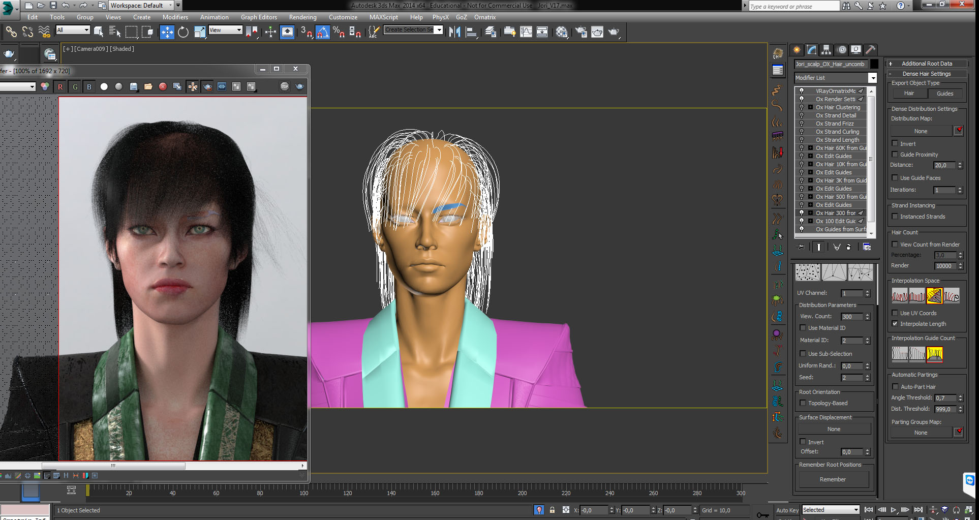 step 2- Then, I add another "Ox Edit Guide" on top of the first "Ox Hair 300 from Guides" then readjusting the hairstyle a little more to acquire a more precise hairstyle, breaking the fringe and having some backhair on the shoulders and sideburns going backward, stranded behind the ears. Then I add another "Ox Hair 500 from Guides"("500" for 500 generated hair).