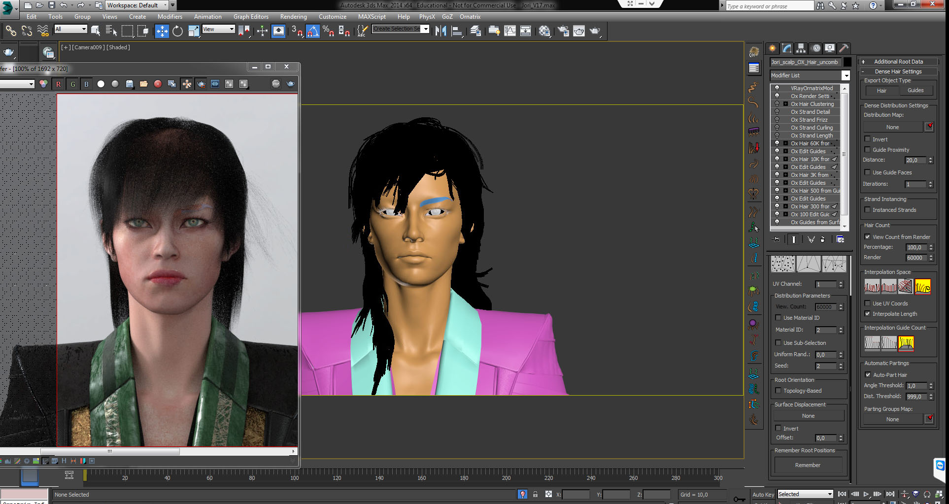screenshot 2 = Comparison between last render (from the screenshot above) and the viewport hairstyle with only the first "Ox Hair from Guides" modifier activated... quite similar! :