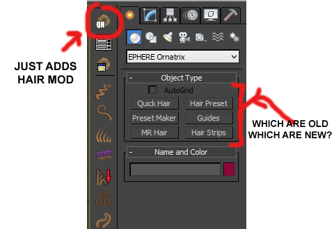 | Description: | To follow up on a "general post" I'm saying it's broken, not that I don't understand it. When I click "Hair Preset" in the creation panel I get a broken bitmap path warning (see attachment). Is this an old button from another version of Ornatrix maybe? When I do it from the toolbar strip, it only adds a fur ball quick hair setup, I get no options for feathers or any Groom panel like it shows in the documentation.