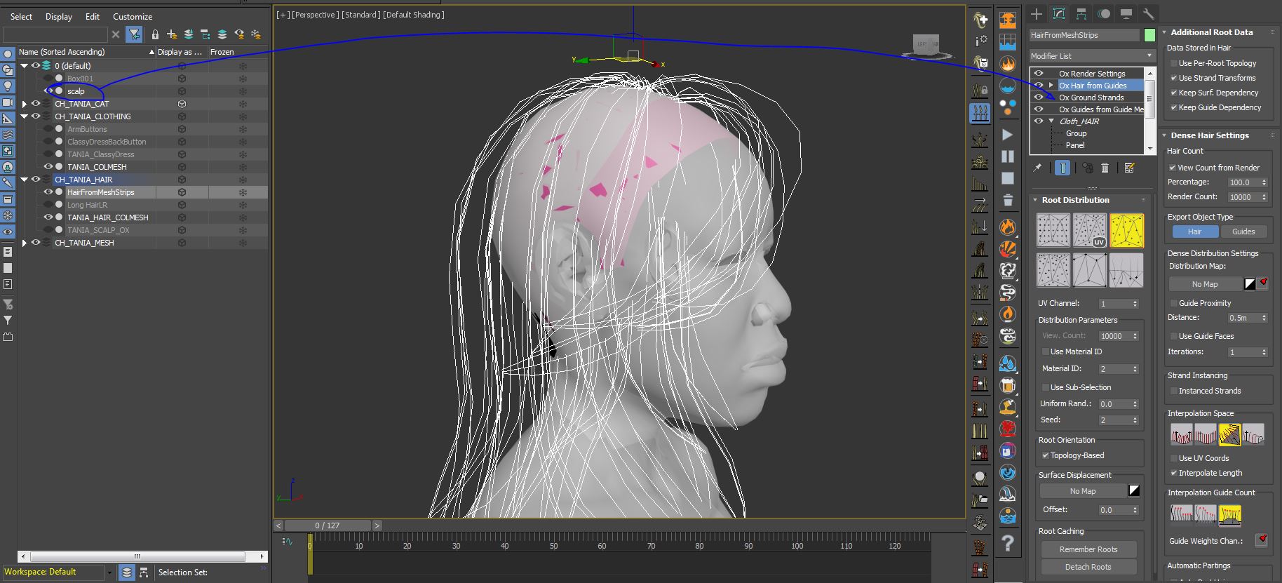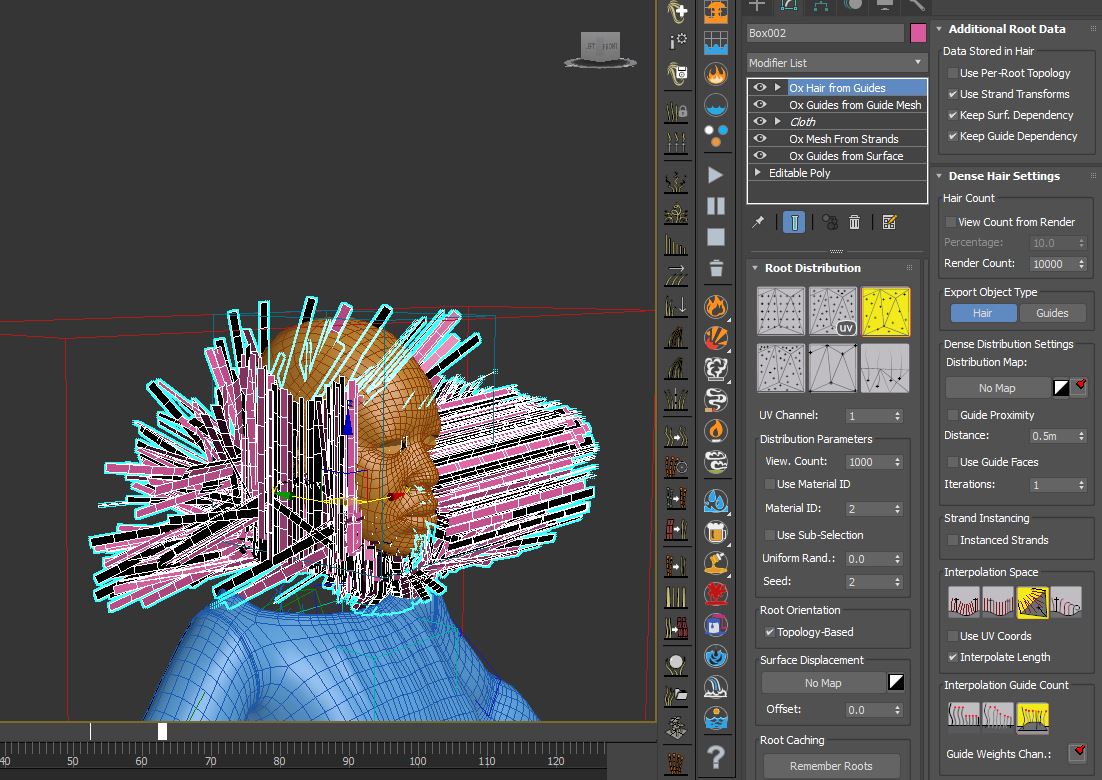| Nildo, the scene have a different hair stack than the one showed in hairbad.jpg. In the scene provided this is a user error: You are using HairFromMeshStrips, this type of hair does not requiere a scalp mesh (an emiter) but HairFromGuides DOES requiere a scalp mesh when you are using a topology dependant distribution type, the hair will be extracted or emited from the mesh scalp and interpolated between the guides created in GuidesFromGuideMesh. To fix this you can change the distribution type to Guides As Hair as shown in the image below: OR you can extract part of the head to use as a scalp mesh/distribution surface/emiter, add an Ox GroundStrands modifier on top of GuidesFromGuideMesh and ground the guides to the scalp mesh. This way you can use any distribution type in HairFromGuides and you'll be able to interpolate hair between guides. I hope this makes any sense, please let me know. Jeordanis Figuereo (Product Designer. EPHERE Inc.) |