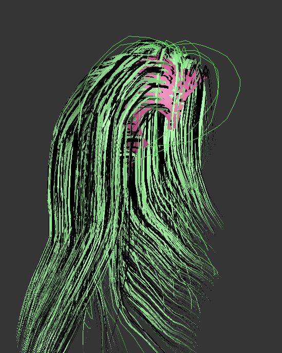 | still trying...there's gotta be a bug on this workflow somehow...i was just testing out the video "Ornatrix 101 - Guides from splines" on youtube..and Im pretty sure Im following every step michael is showing...down to the alignment and xforming etc..the hair gets interpolated ONLY when "roots detached" from Ground strands mod is off..and even then it does not seem to interpolate correctly... in the attached image the hair should be interpolating between the green lines..but it seems to be doing a bit more than that |