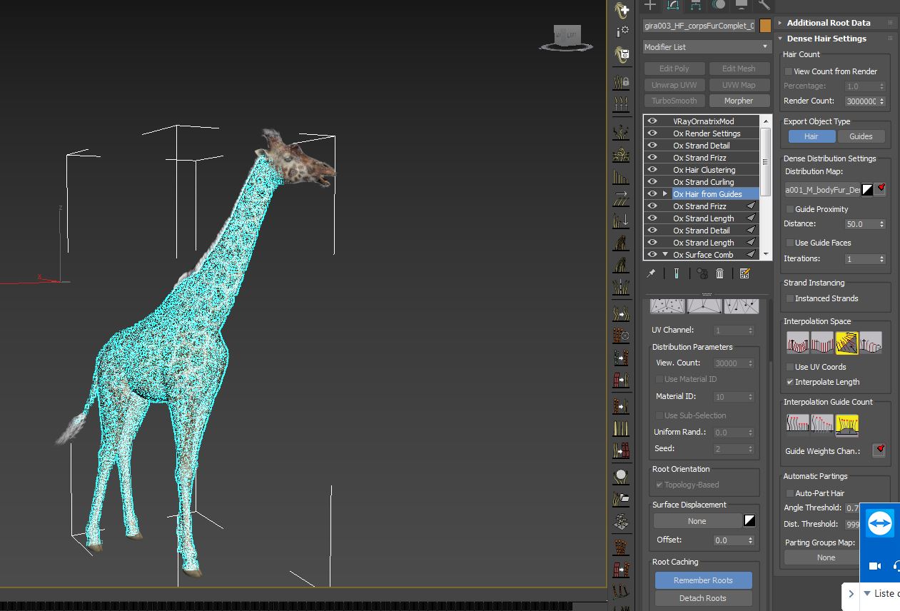 | Description: | Hi ! I have a mysterious problem: i have a giraffe with ornatrix system, rendering perfectly in interior ambiance (Vray Light classic), but when i render in large scene, with VraySun, the fur on the body be rendering with the count of viewport, with the exact same parameters of rendering, just the ambiance change Can you help me ? Thank you |
