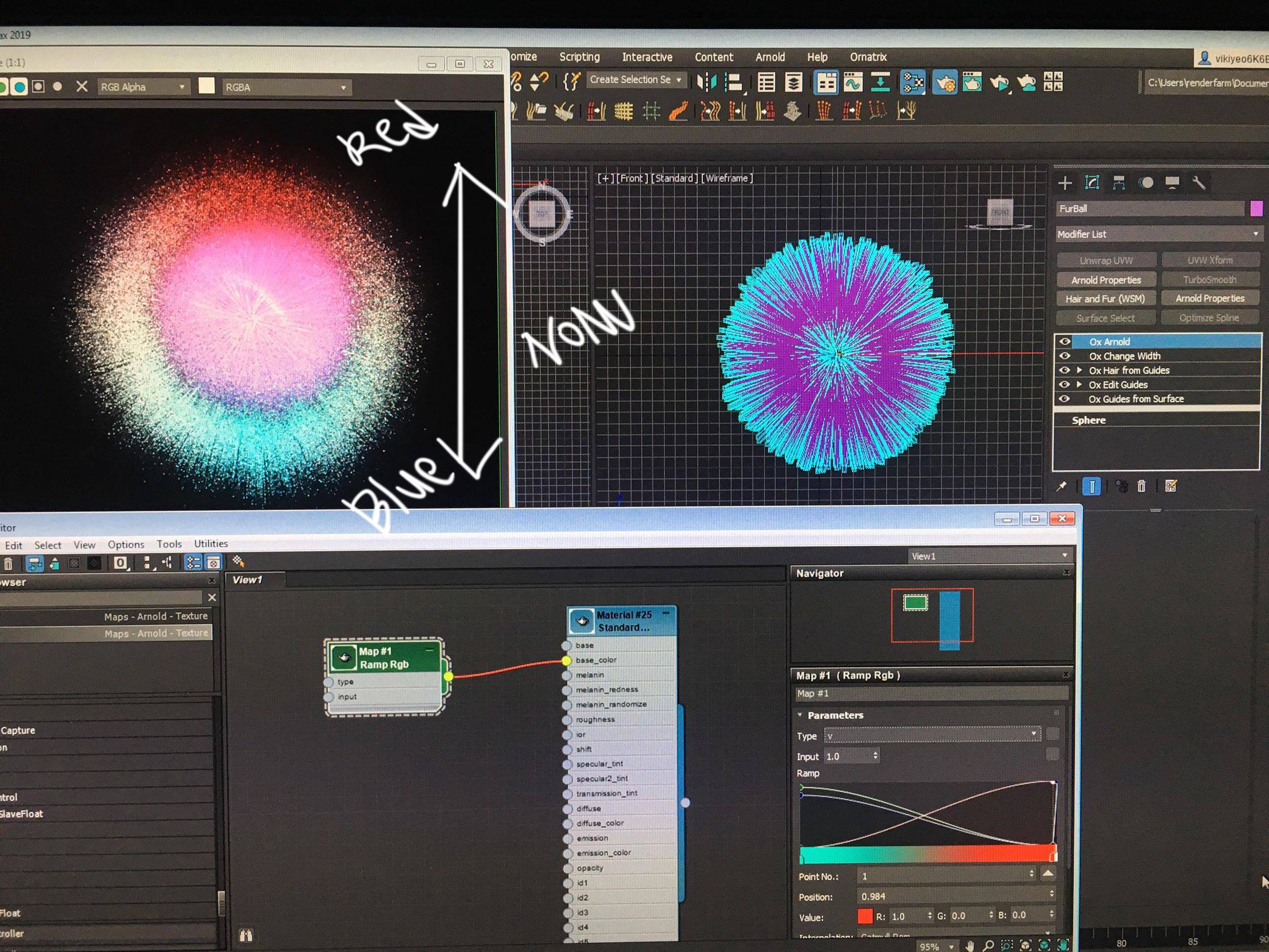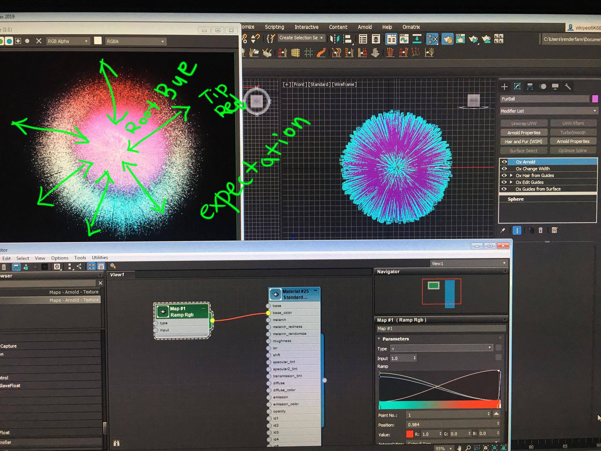 how can I put the different color from the root to the tip? I can use the ramp but it's working buy screen view like the picture I attaced. not actually in the root and to tip color.