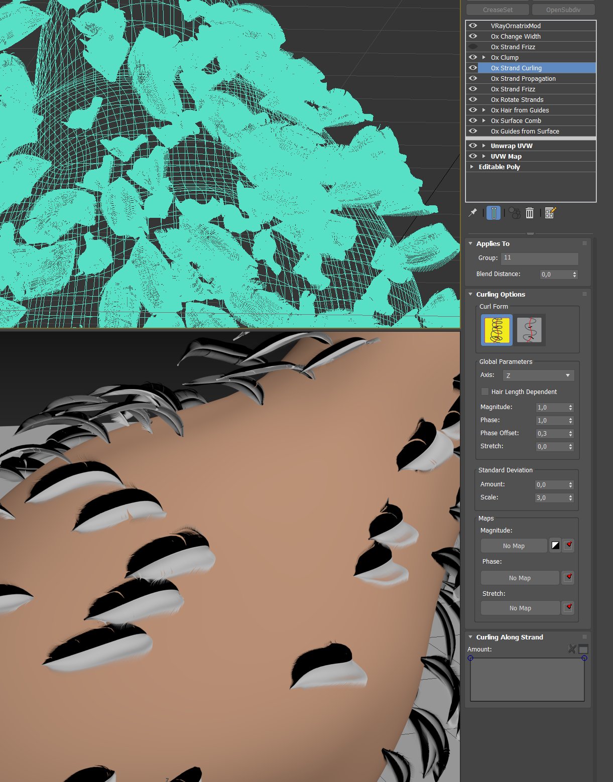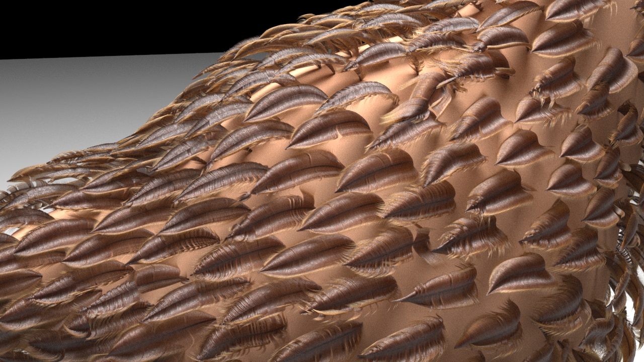| Hi. Try making two strand groups for each side of the feather and use two Curl modifiers to bend each side individually. The shading difference that you see in the viewport is just the normals of the strands. That just means that the normals of the strands on one side of the feathers are pointing in the opposite direction. That wont affect the render and is not related to your question. You can change this by increasing the facing camera hairs in the Ornatrix settings(Ornatrix tool bar). Jeordanis Figuereo (Product Designer. EPHERE Inc.) |