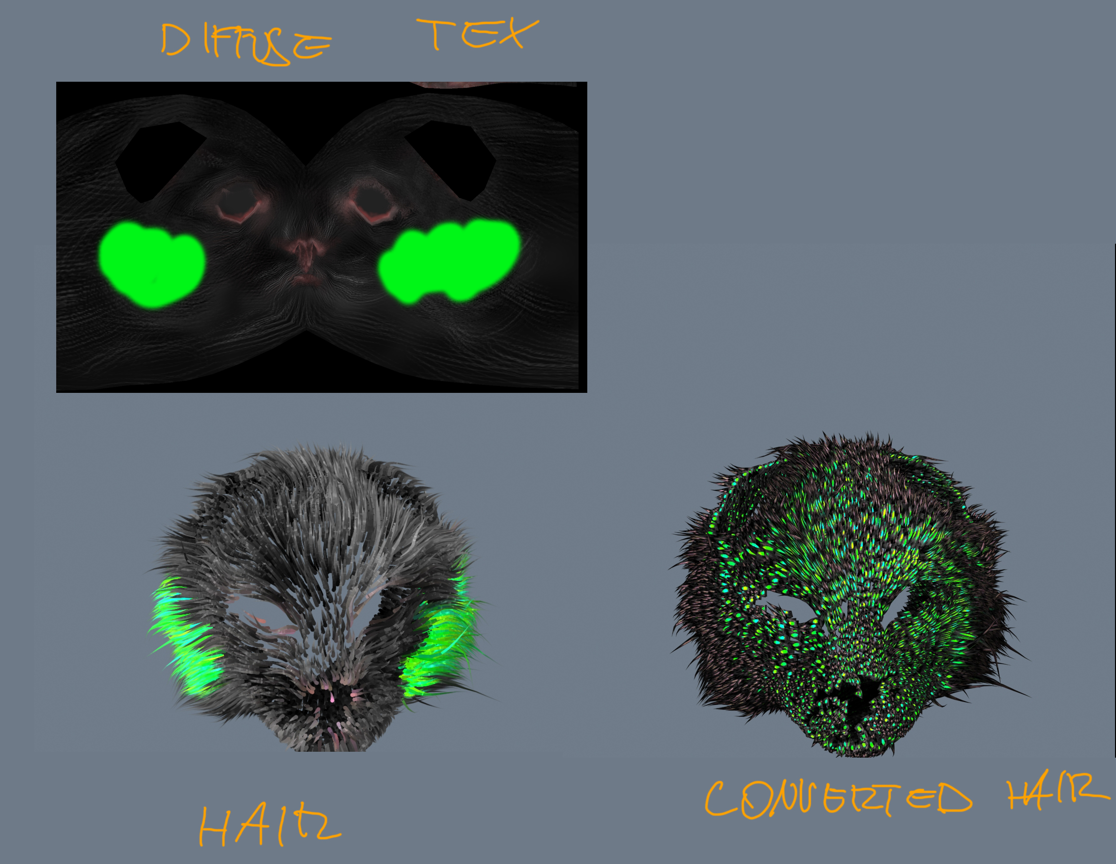 If its hair, there is no problem with that, I use any ornatrix hair shader, apply "OR HAIR map" in difusse slot and than add my difuse map to root slot. Thats working fine. But how do that if its converted to hair mesh ? Thanks for answer.
