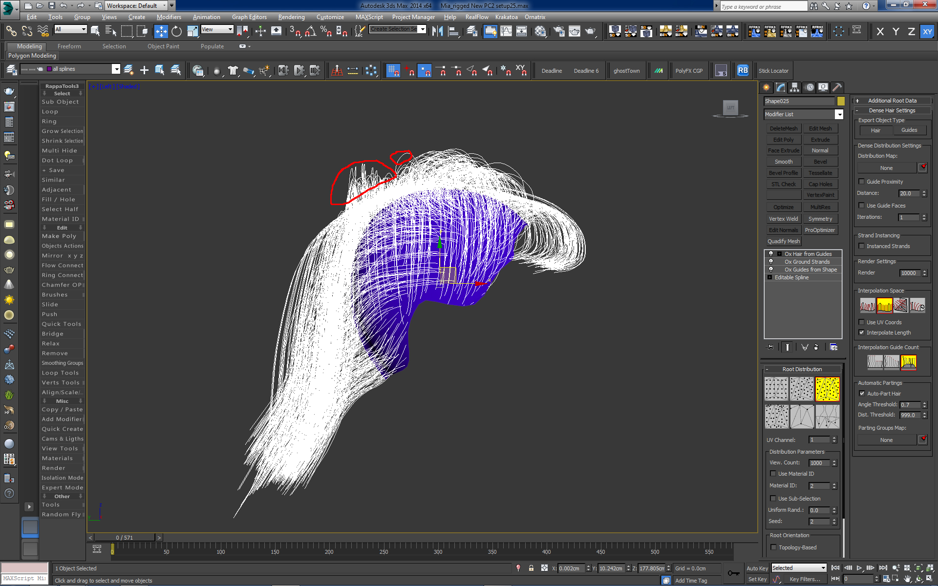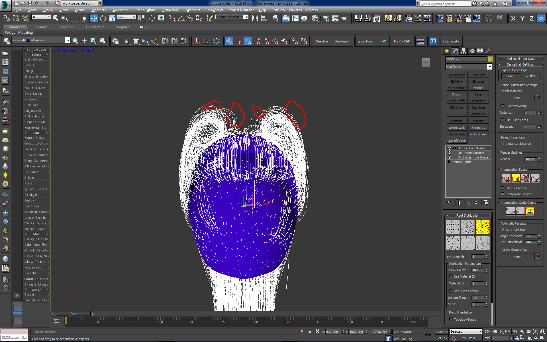 | Hello, In the first scene you posted I think it’s mostly a matter of having a complete hair set of guides if you want to cover the whole scalp. In that file there are only guides for the top and middle of the head. In that case this style will be interpolated all over the mesh you ask to create hair from. If you restrict the scalp to where you have placed the guides you will have better luck (images attached). On the images that you just posted you have more guides for the rest of the scalp but there are places that should not interpolate like you have circled. If you create a Part for these areas they will not interpolate and give you a closer fit to your guides. I hope that helps Thanks Michael McCarthy |