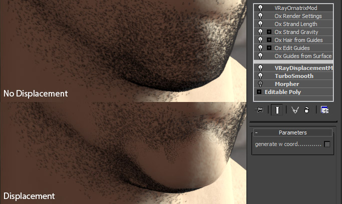 I am trying to create beard stubs so it is important that it conforms to the surface of the displaced mesh. (Plus, it is going to be animated.)