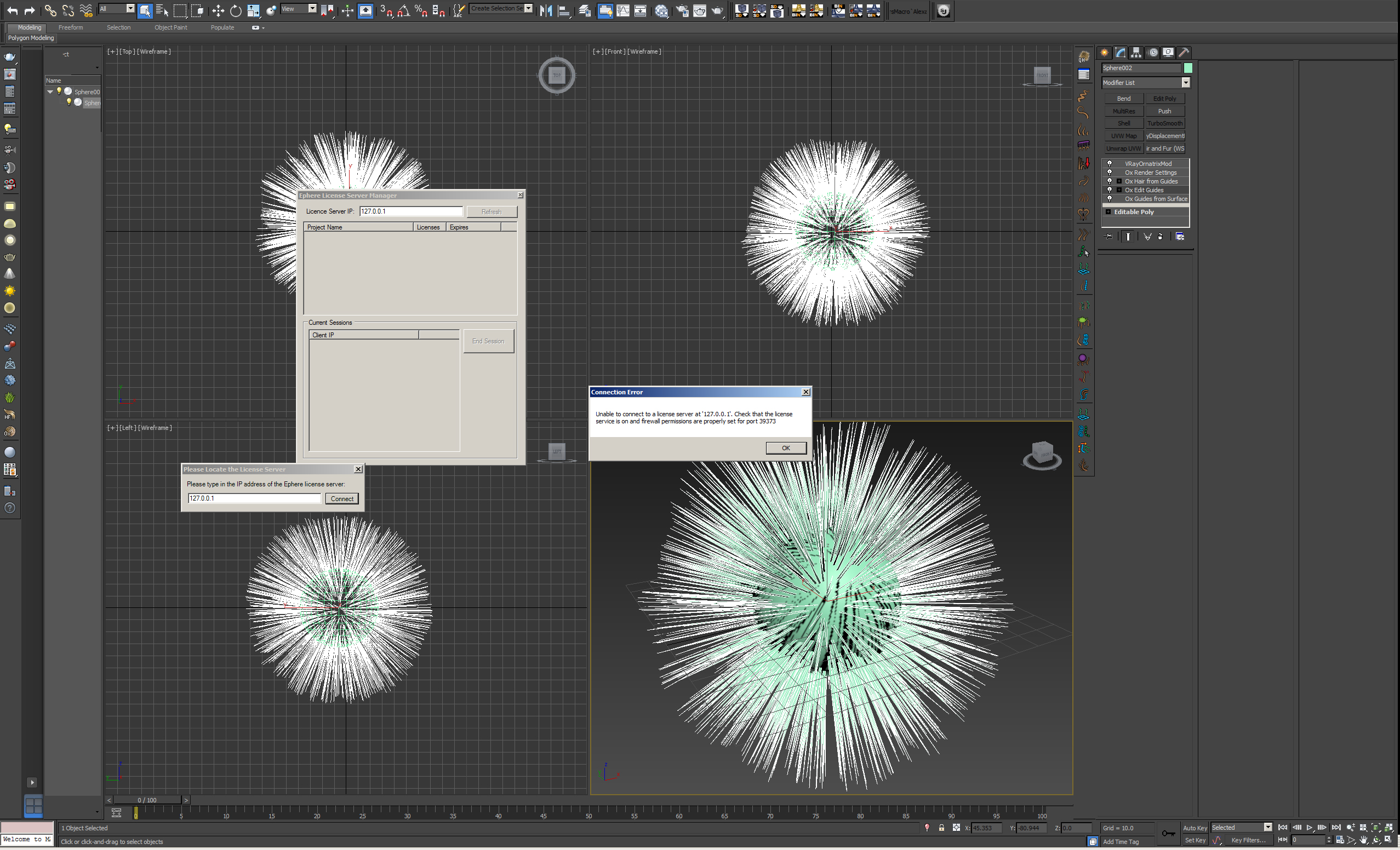 | I downloaded the License Manager and installed it. But it still doesn't work. Nothing shows up on it. When I create a sphere and apply an Ornatrix Hair Mod, it applies okay, but after clicking through the modifier stack a few times the "Please locate the License Server" notice pops up.Here is a screenshot of the situation I have.... Super frustrating! Attached Files: John Brophy Fine Art www.jbrophy.com |