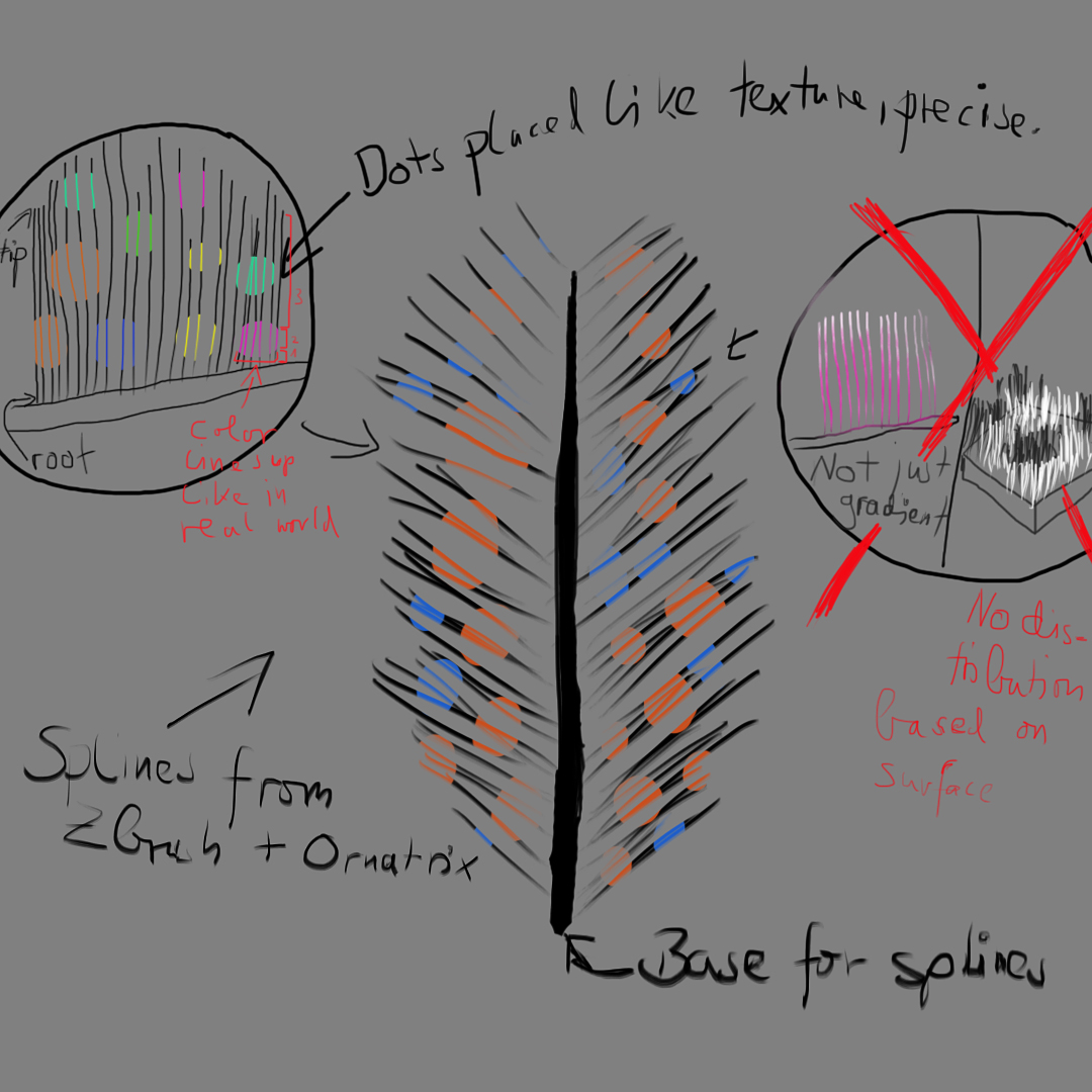 in a few days i will start a new project that will include feathers, and i want to prepare for that in advance. The feathers on the creature will have a huge range of color variation, not only from the strands to the tip of the hairs, but also other very uniqe spots like you can see in a reference image that i attached.