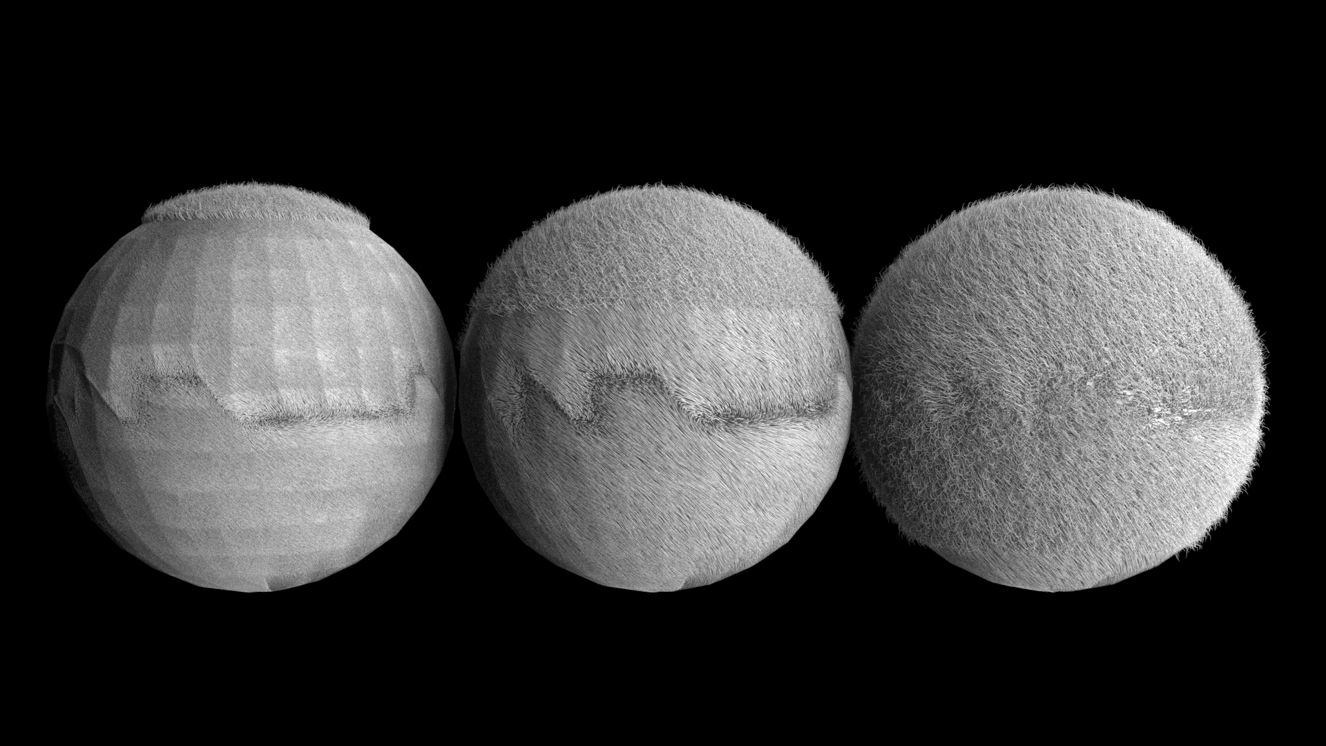 | Hi Michael, Thank you for getting back to me. I'm not doing anything crazy. Just dropping a standard quickhair on an object, then I surface comb and increase the density of the rendered hair. I then add a frizz and voila, the problem is there. Here's a max file with 3 spheres with different haircounts. I'm attaching a render showing the probelm i'm having. First is a million hairs, second is 250k and last is 100k. The lower the haircount, the less the problem is visible. Red |