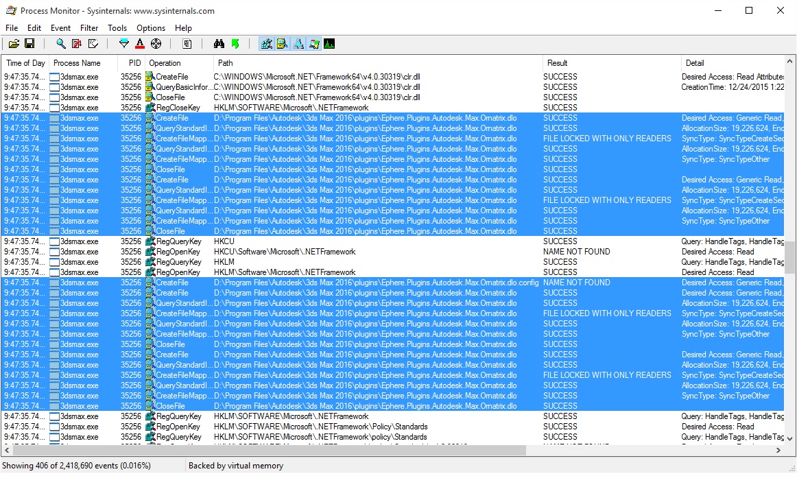 | Your system services applications much faster than mine :) You should try Process Monitor to check the file accesses (not Task Manager). From www.sysinternals.com Include a filter to log any process name starting with '3dsmax' (without quotes), start logging, and then start 3dsmax.exe. You'll get a lot of irrelevant Windows-related and other processes. You remove them from the log by adding exclude filters for their process names and refreshing the log. Or let them there and Ctrl+F to search for any ornatrix entries in the log. They come in blocks of lines. |