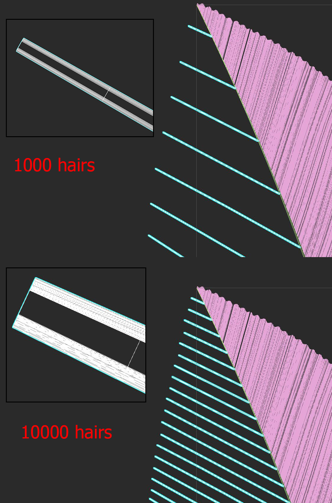 The hairs are first created on a spline, then grounded to a super thing strip of geo. After a bit of trimming with an 'OX Edit Guides' modifier, I get guides like in my other post I left today: