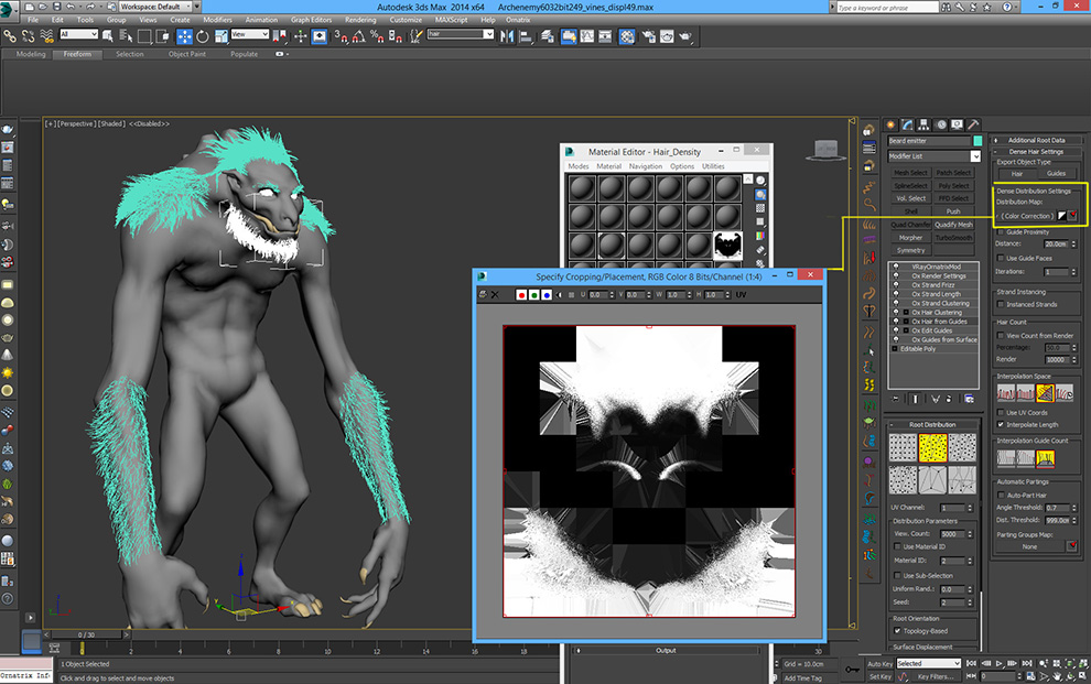The characters model has separate hair emitters for hair, beard, eyebrows, and fur on the arms. A map was used to control the placement of the hairs in conjunction with other Ornatrix distribution parameters. Alessandro: "A distribution map placed into the hair from guides modifiers for head hair, beard, and eyebrows played a crucial role to have a more natural hairlines and transitions with the skin."