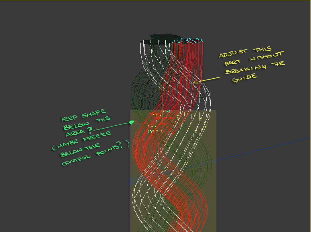 | Description: | Would it be possible to 'Pin' or 'frezze' certain parts of our guides (not the whole guide tough) so we can adjust or brush the guide without affecting the 'frozen' parts? Say a character has a Pin or something keeping the hair fixed to a spot but the Art Director wants more volume somewhere on the front. That would make it possible to make changes on the base of the guide without shifting the rest of the guide.. or is this feature already implemented in OX and I'm missing it?