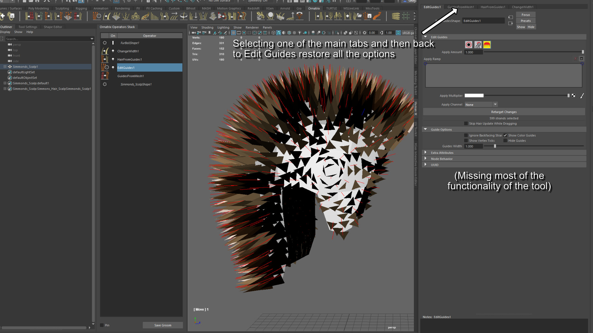 | Hi, Not used Ornatrix in a while but have found in the latest build this edit guides bug has returned. Clicking another tab and back again works sometimes, so same 'workaround' as it was before this got fixed. Only tested this in Maya 2018.7 OX V2.5.4.25492 |