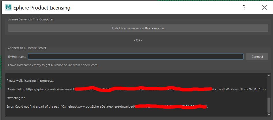 | Description: | Hey team, currently having an issue licensing Ornatrix, was working previously but today all 3 of our work computers (across multiple sites), have stopped working and we get the following output when installing the license server: Please wait, licensing in progress... Downloading https://ephere.com/licenseServer.REDACTED.zip Extracting zip Error: Could not find a part of the path 'C:\inetpub\wwwroot\EphereData\ephere\download\REDACTED'. I just redacted the parts with computer name etc, but we all have the same error. |