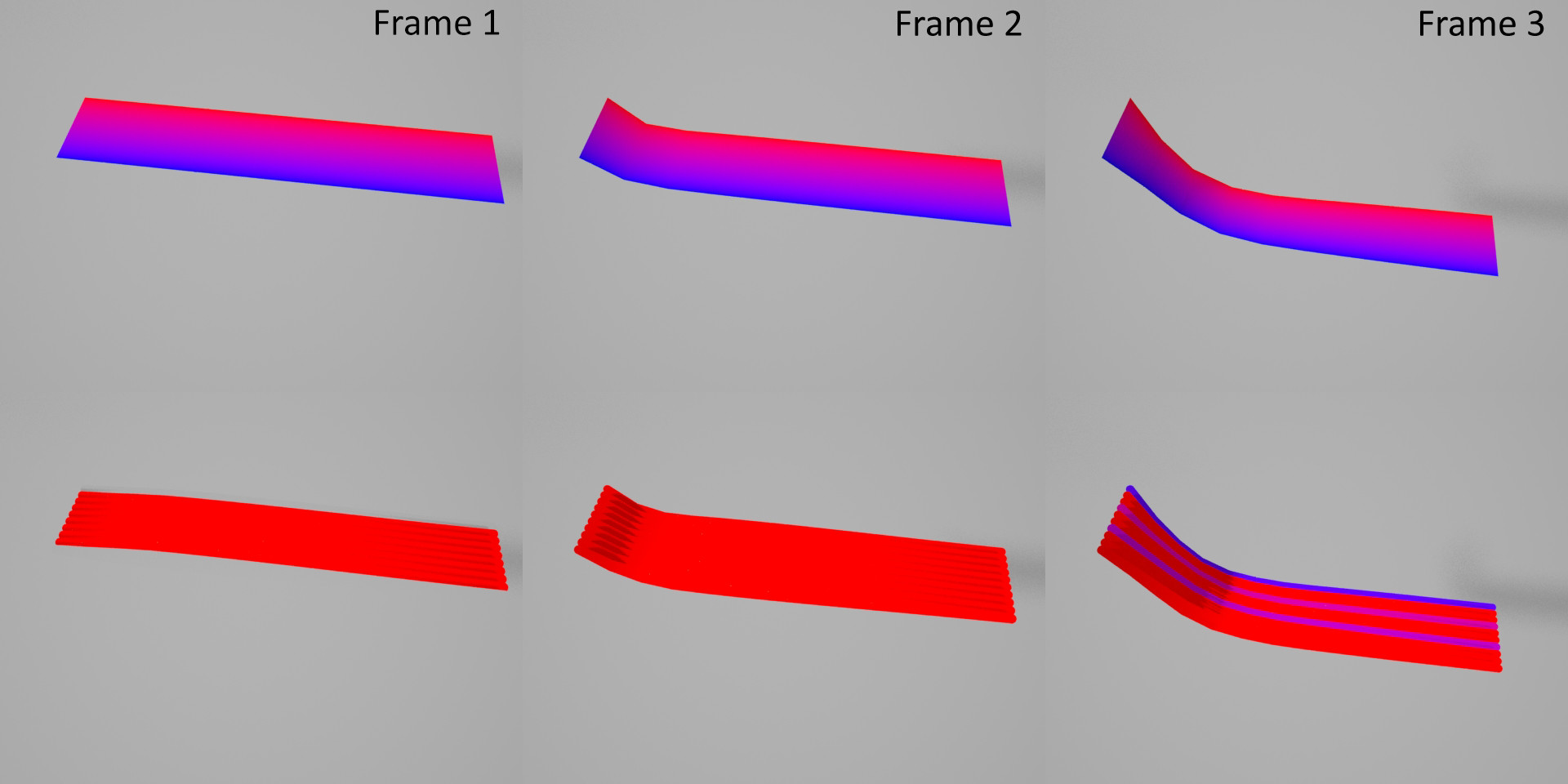 | Description: | I am attempting to create HairFromMeshStrips using nCloth output cloth. I'm attaching an image of what happens. The top is an nCloth mesh with a ramp texture applied. The bottom shows HairFromMeshStrips (+ a RenderSettings node) on the same nCloth with the same texture plugged into a RedshiftHair shader. First of all, the hair (at the roots) doesn't inherit the color of the nCloth strip. More importantly, the hairs can change colors between frames. I don't think this is expected behavior? If so, how do I "stabilize" the hair colors so they don't change between frames? |