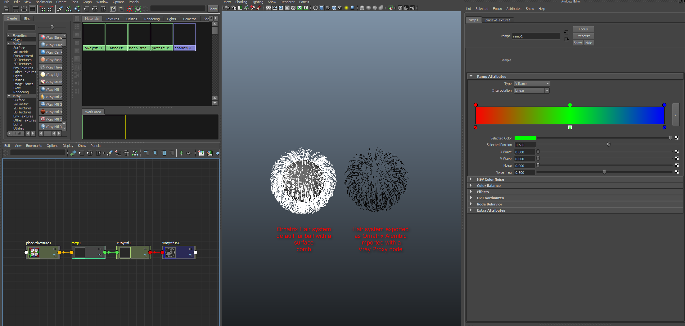 | Description: | Hey Marcel, If i'm bugging you guys to much let me know. But I came across and odd behaviour and was wondering if it was a bug. Basic "fur ball" hair render in maya doesn't seem to take the underlying UVs, but when exported via Ornatrix .abc it renders as expected. ?? wierd? I can get the desired result if I put a MeshFromStrands node but that defeats the purpose of a curve/hair primative.... distance along strand from the VrayhairSampler works perfectly FYI.... I can work around it by just exporting an .abc file before i start dev, but thought I'd bring it up. in the second picture I'd expect both furballs to look like the one on the Right (.abc via vray proxyNode) |