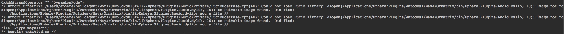 | Ok, so installation is right, you have the correct files. In that case, however, it is impossible that you still get the same error, the one that says "Library not loaded: /Users/ephere/buildAgent/work/ etc..." If it still won't load for you, please provide the new errors that you get. As for uninstallation, deleting /Applications/Ephere generally is fine. The set of commands for full removal is this: rm -rf /Applications/Ephere/Plugins/Autodesk/Maya/Ornatrix rm -rf /Applications/Ephere/Mono64 rm -rf /Users/Shared/Ephere/Ornatrix rm -f /Users/Shared/Autodesk/modules/maya/Ornatrix.mod pkgutil --forget com.ephere.plugins.autodesk.maya.2015.ornatrix pkgutil --forget com.ephere.plugins.autodesk.maya.2016.ornatrix pkgutil --forget com.ephere.plugins.autodesk.maya.2016.5.ornatrix pkgutil --forget com.ephere.plugins.autodesk.maya.2017.ornatrix (with administrator rights) Ivan Kolev (Software Developer, EPHERE Inc.) Discord: ikolev |