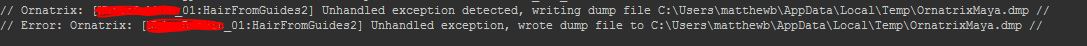 [Error ] [t 33020] [tid main ] [M 2351480] [Ephere::UnhandledExceptionFilter] [_01:HairFromGuides2] \Ephere\NativeTools\SystemToolsMsw.cpp(1165): error: Unhandled exception, wrote dump file to C:\Users\PATRIC~1\AppData\Local\Temp\OrnatrixMaya.dmp