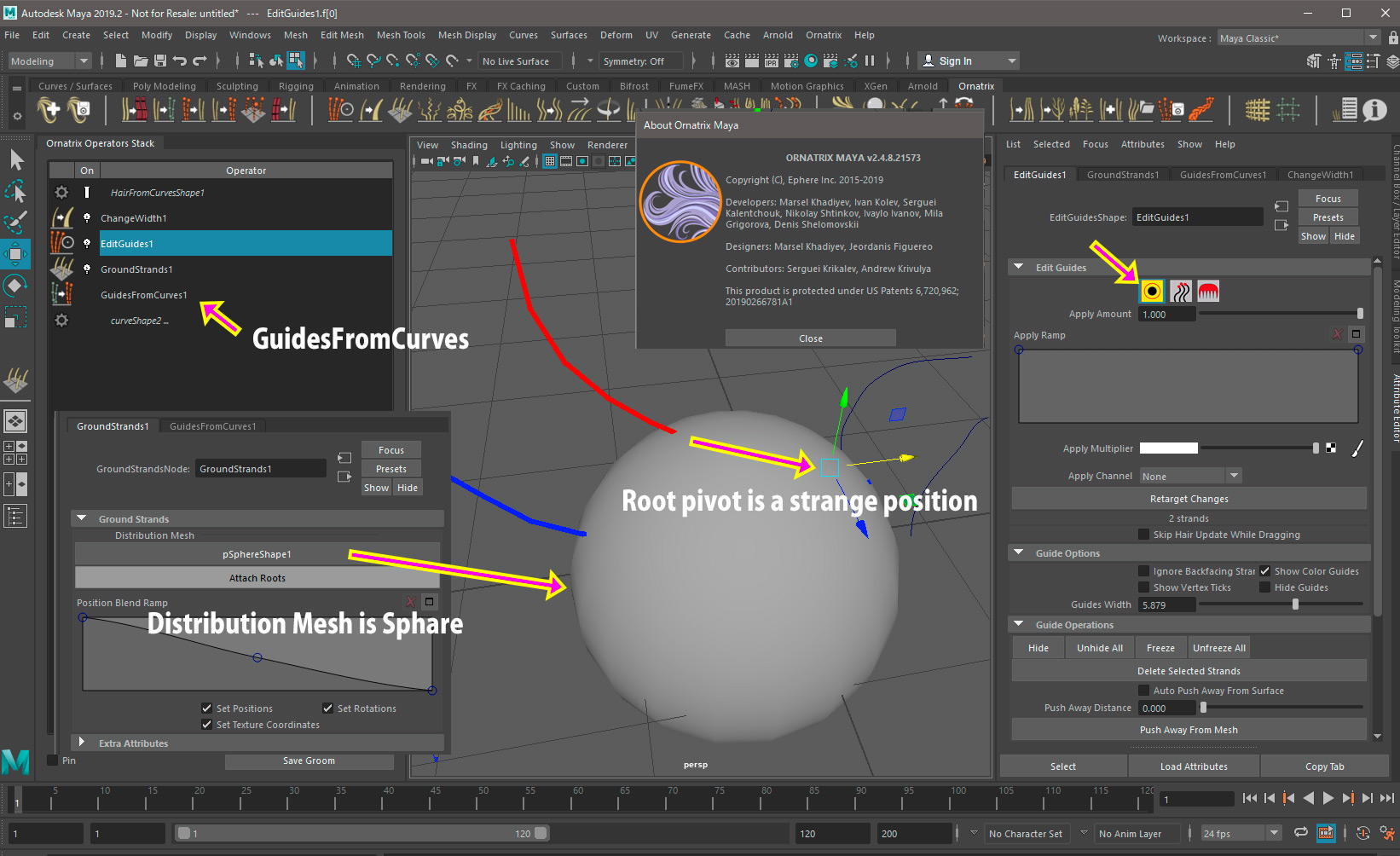 In Ornatrix Maya v2.4.8.21573 + Maya 2019.2, if you create a guide with GuidesFromCurves and try to move the root with EditGuides, the pivot of the root will be displayed in a incorrect location.