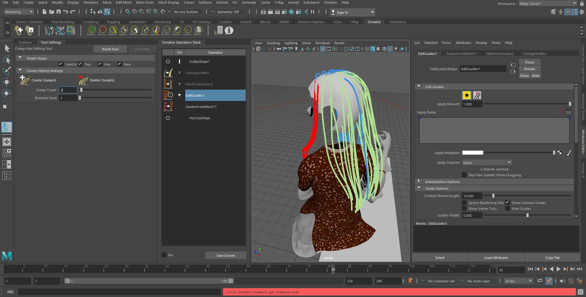 1- Can I select a number of Hair Guides, and Clump them? It crashed Maya 2020.2 first time i tried it. In the video, he selects the hair when "FurballShape1" is active. I dont like it, because selecting process becomes harder. I prefer clumping but hair guide. The second time i tried it, ornatrix wont let me clump it. See screenshot ( EditGuides1 is active while i push Clump button ). | |
