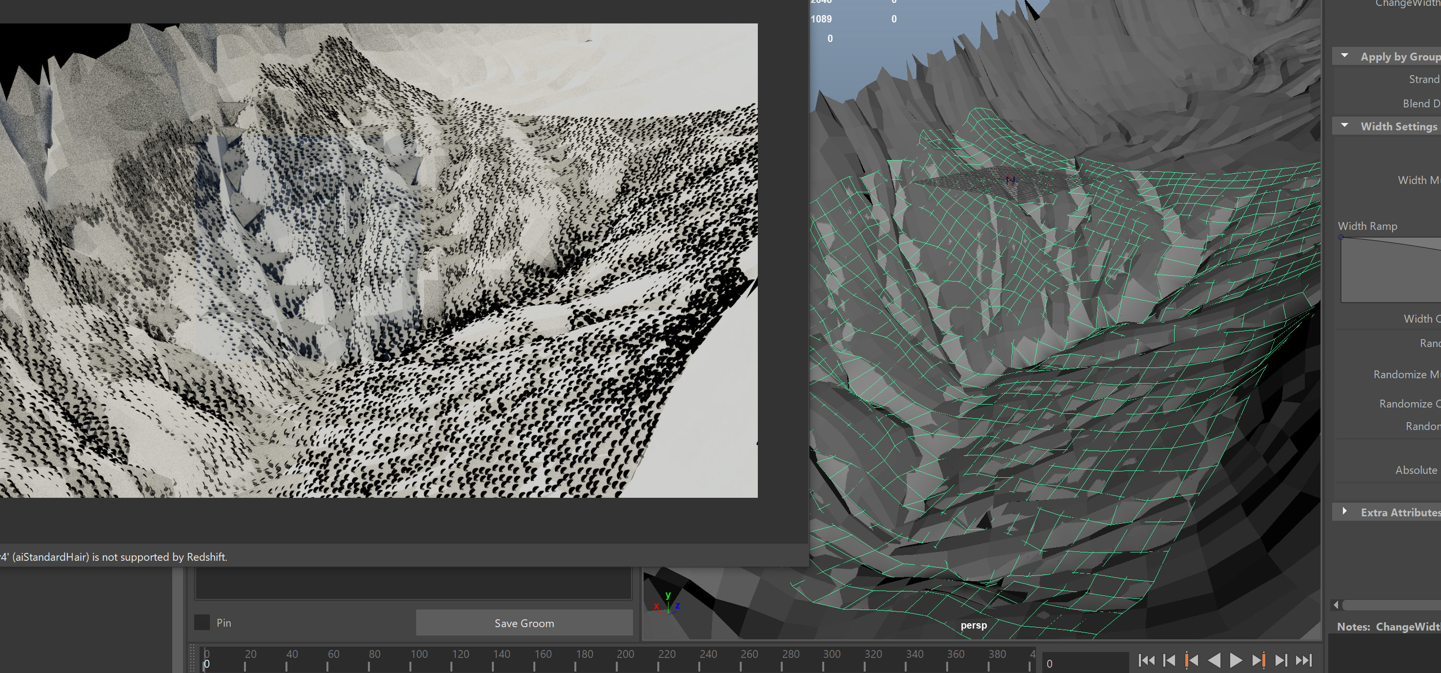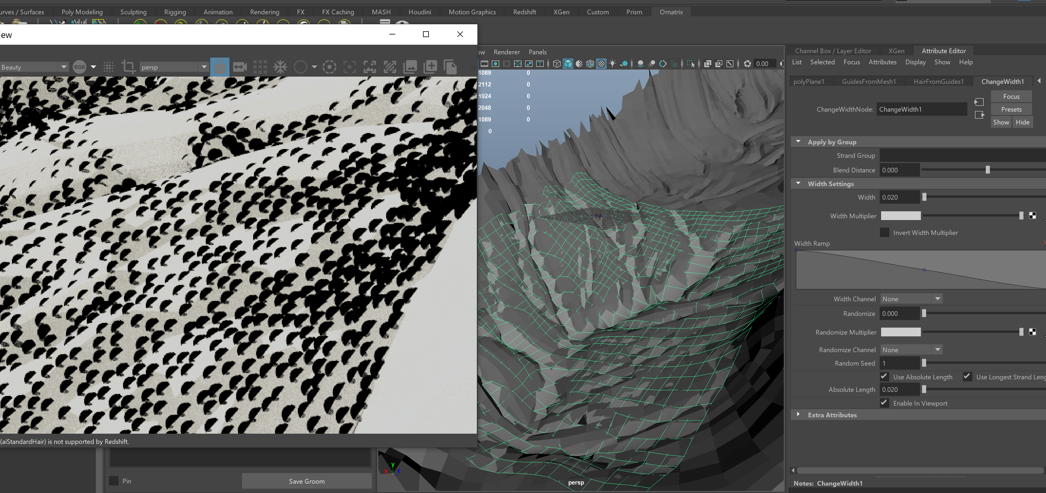 If so, I noticed that you are rendering with Redshift, which at its current version has an issue with the ChangeWidth node in Ornatrix. We informed the Redshift dev team about this issue and they are working on a fix. Keep an eye up for a Redshift update soon.