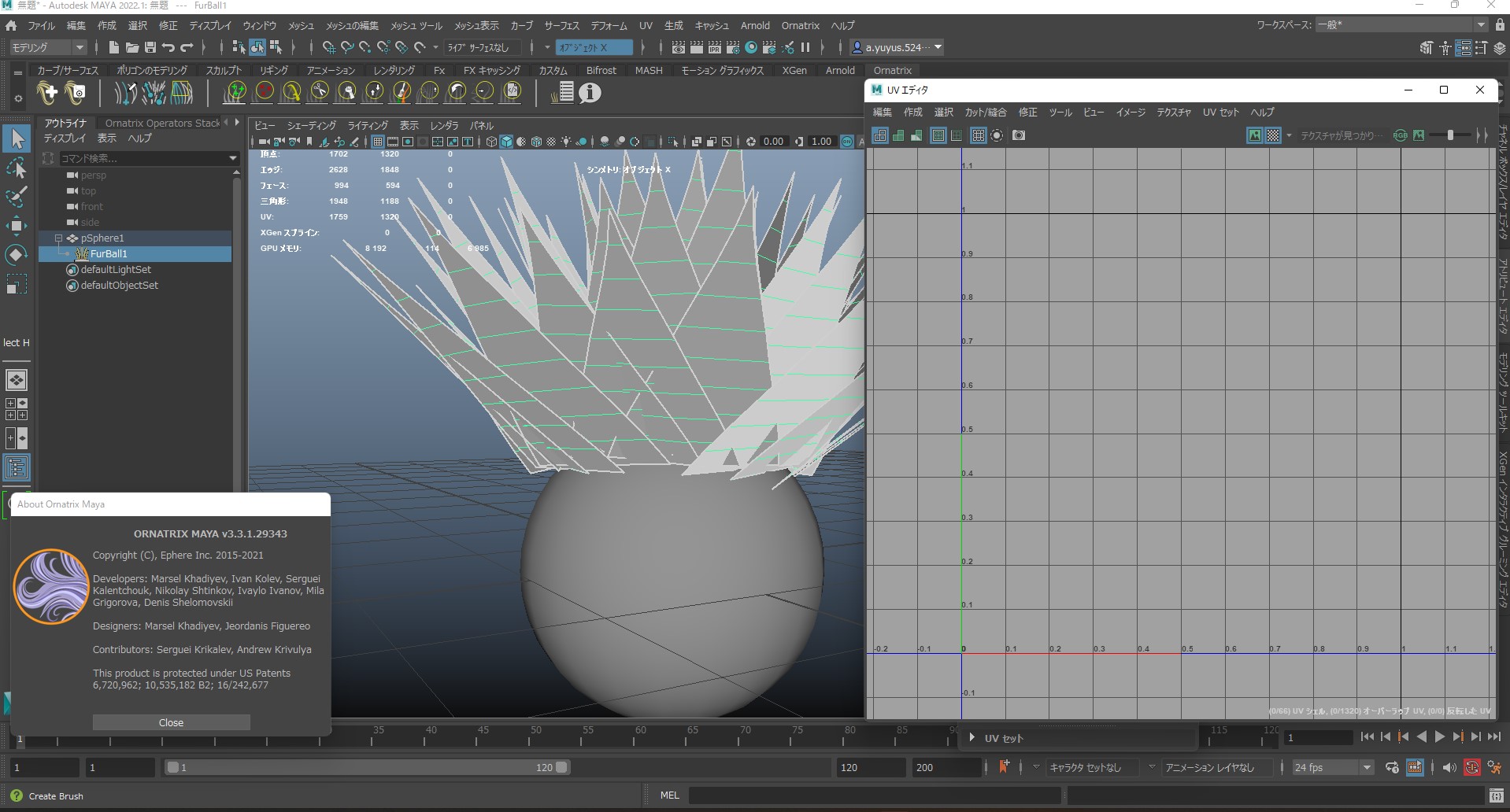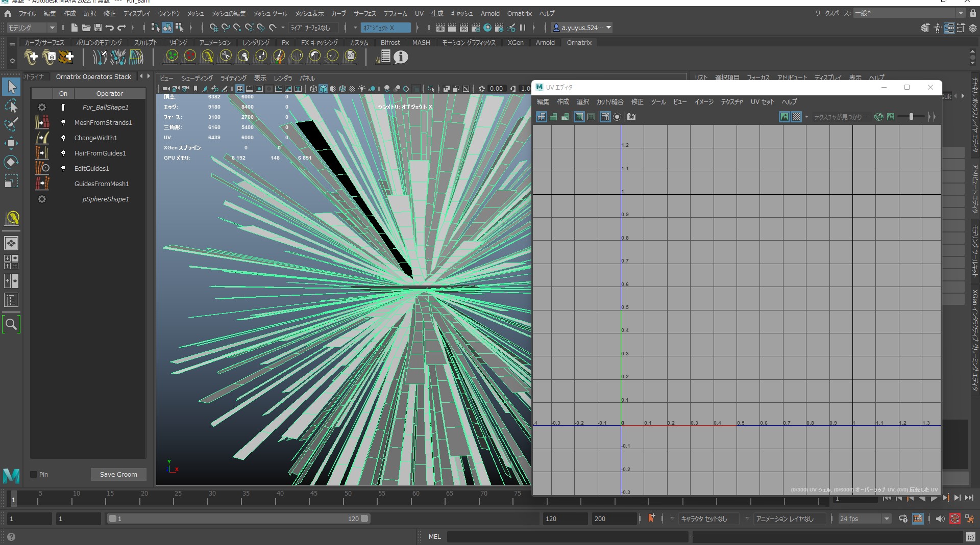 | I decided to start over, so I opened a new scene in maya and added an ornatrix FurBall to the sphere. However, when I select MeshFromStrands and open the UV editor, nothing shows up in the UVs as shown in the image. The UVs of the original sphere show up fine. Attached Files: |