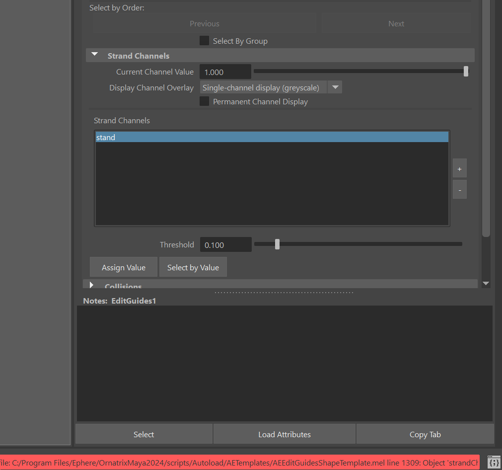 Autoload/AETemplates/AEEditGuidesShapeTemplate.mel line 1309: Object 'strandChannels' not found.