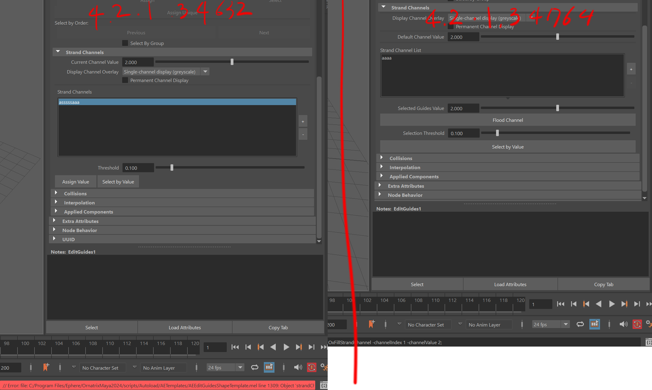 // Error: file: C:/Program Files/Ephere/OrnatrixMaya2024/scripts/Autoload/AETemplates/AEEditGuidesShapeTemplate.mel line 1309: Object 'strandChannels' not found.