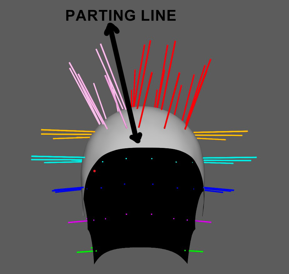 It would make sense to split it up like top and bottom so that I can perform a comb on the botttom guides and style the top guides irrespective of the bottom guides. The parting line is also something I'm interested in learning about. I have found that I can change the interpolation settings so should I just add more guides along the parting line to get better control? Or is there another way to create a parting line?
