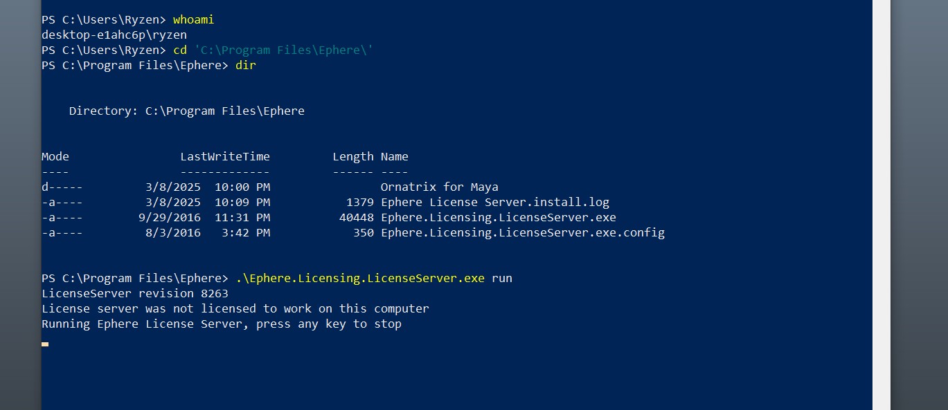 when I manually start the license server in the power shell, the last image is what I get. Says its running, but not licensed for this computer :/