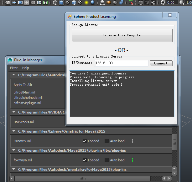 | Hello, I am not sure if you received my email reply. Please use the steps here to install the license for Ornatrix Maya: https://www.ephere.com/web/applications/ephere/docs/Installing_a_Floating_License_Server.html You need to use the "Install License Server Only" link on the downloads page to add the Maya license: https://www.ephere.com/plugins/autodesk/maya/ornatrix/downloads.html Marsel Khadiyev (Software Developer, EPHERE Inc.) |