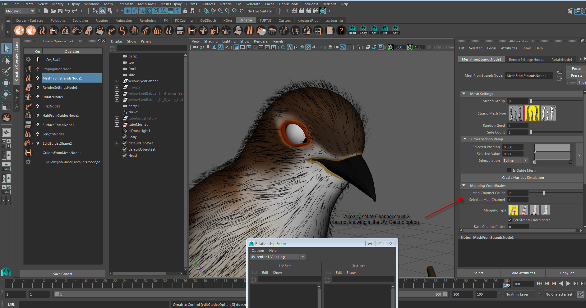 Hi, I am having a issue with the Mesh from Strands Operator. I want to make feathers with multiple uv channels so that i can apply multiple texture. But somehow when i have Edit guides Operator along with Mesh from Strands Operator in my Operator Stack, my feathers are not showing map channels in "UV Centric panel" in MAYA. Please help... |