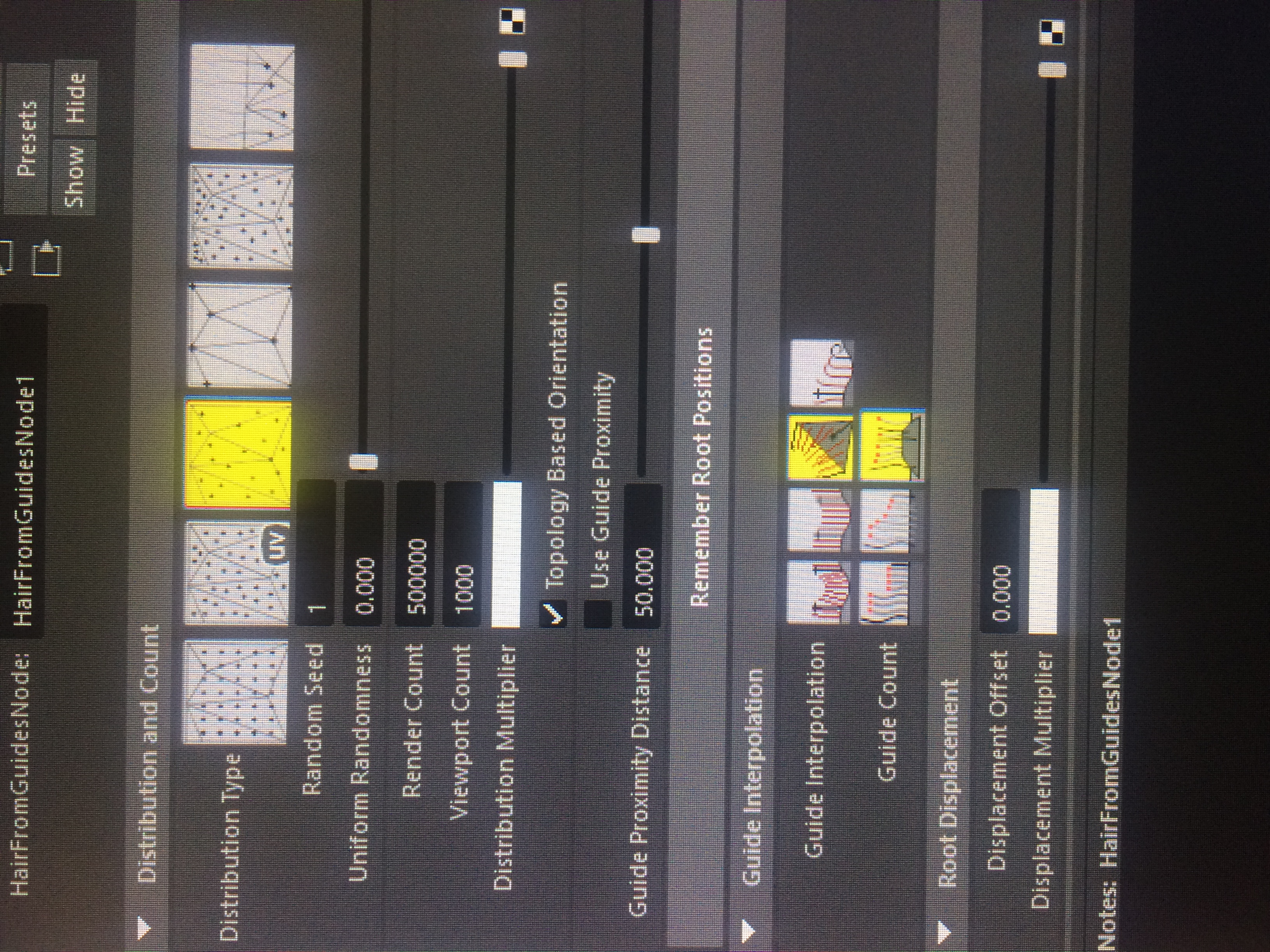 | Hi Felipe, Try using a Random Distribution Type in the Hair From Guides operator. Jeordanis Figuereo (Product Designer. EPHERE Inc.) |