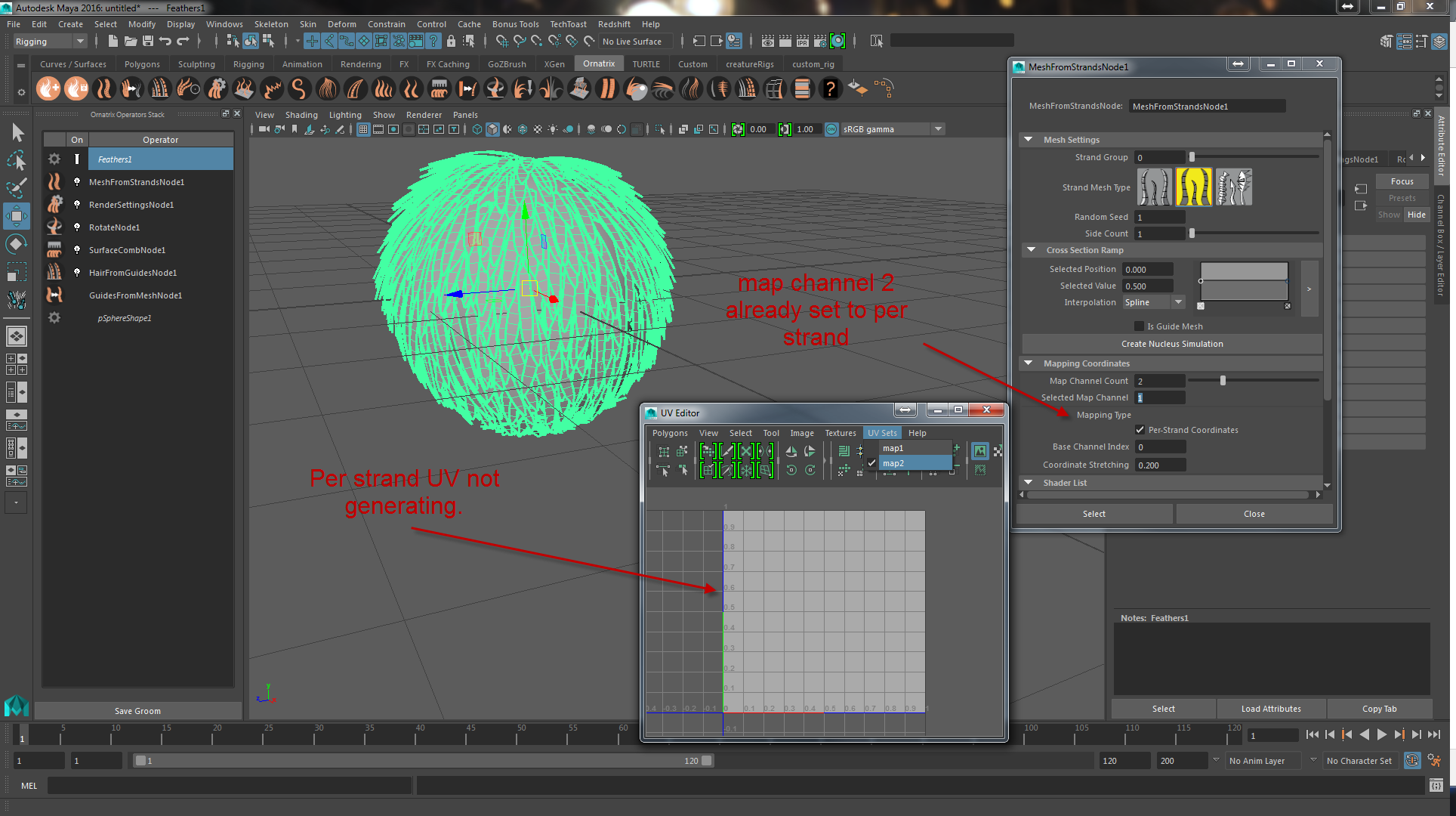 | Hi Jeff, Here I included my test scene. Base Channel Index is used to set which UV set of the distribution mesh you want to use for the feathers, in this case you need a value of 0. You can take a look at this video to learn more about the Mesh From Strands operator:
