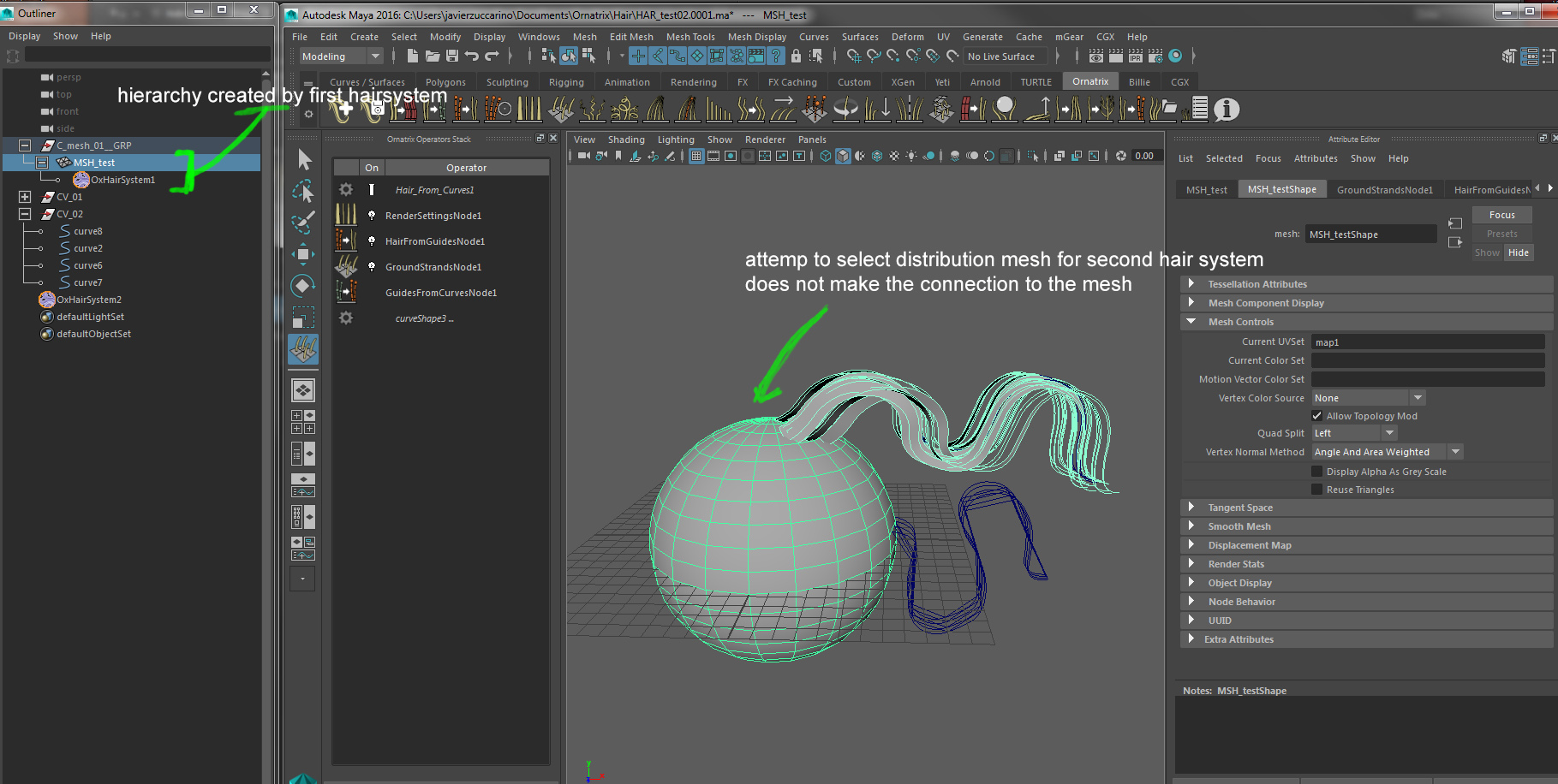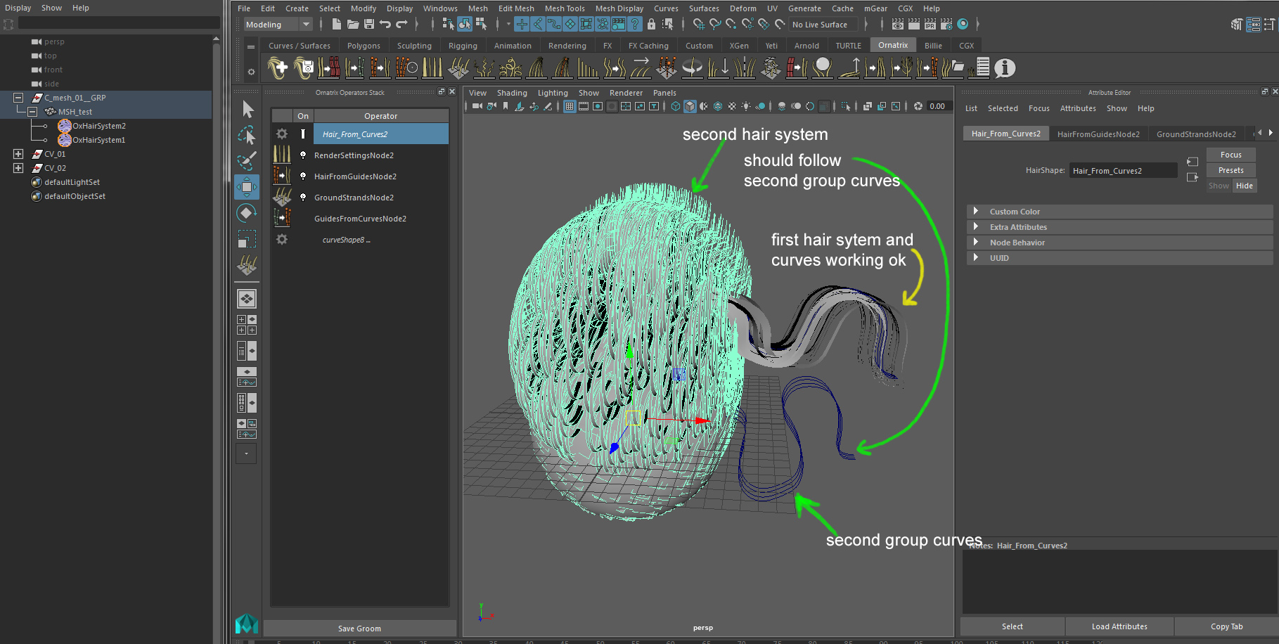 The first problem that I found is when I select the distribution mesh for the second group of curves it selects the first ornatrix hair system and do not make the connection to the distribution slot of the second hair system