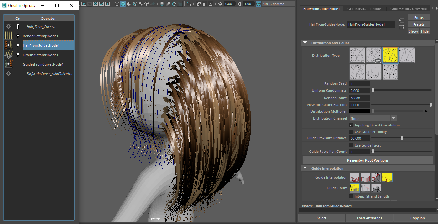 | You want the hair to follow the guides as close as possible, right? Paint your distribution mask very close to the guides, use a separate scalp/distribution mesh for the hair, don't use the body, a smaller distribution area will give you a more accurate hair count and distribution, then for Guide Interpolation try Affine, for Guide Count try Between Two Guides and Three guides. Jeordanis Figuereo (Product Designer. EPHERE Inc.) |