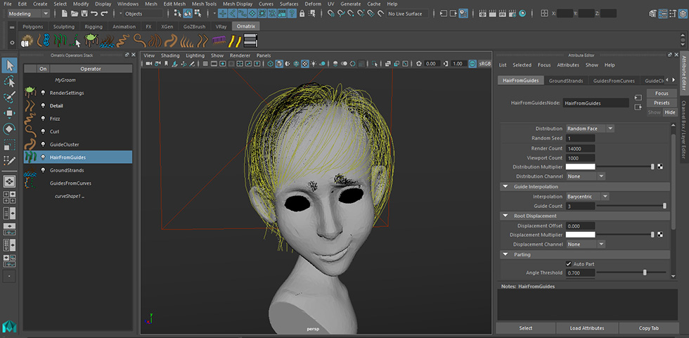 Quick hair setupThe Ornatrix Quick Hair button was then used from the shelf to create hair for the character. Multiple other operators were added to the hair stack to give hair its shape and clumpiness.