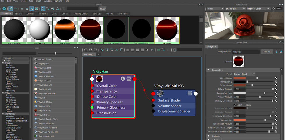 Material setupVRay material was configured to produce the shiny red hair in hypershade.